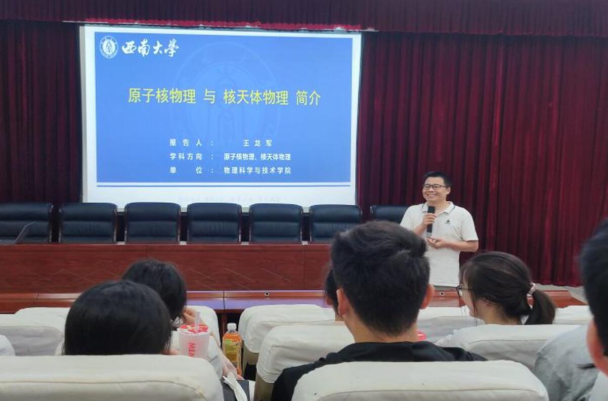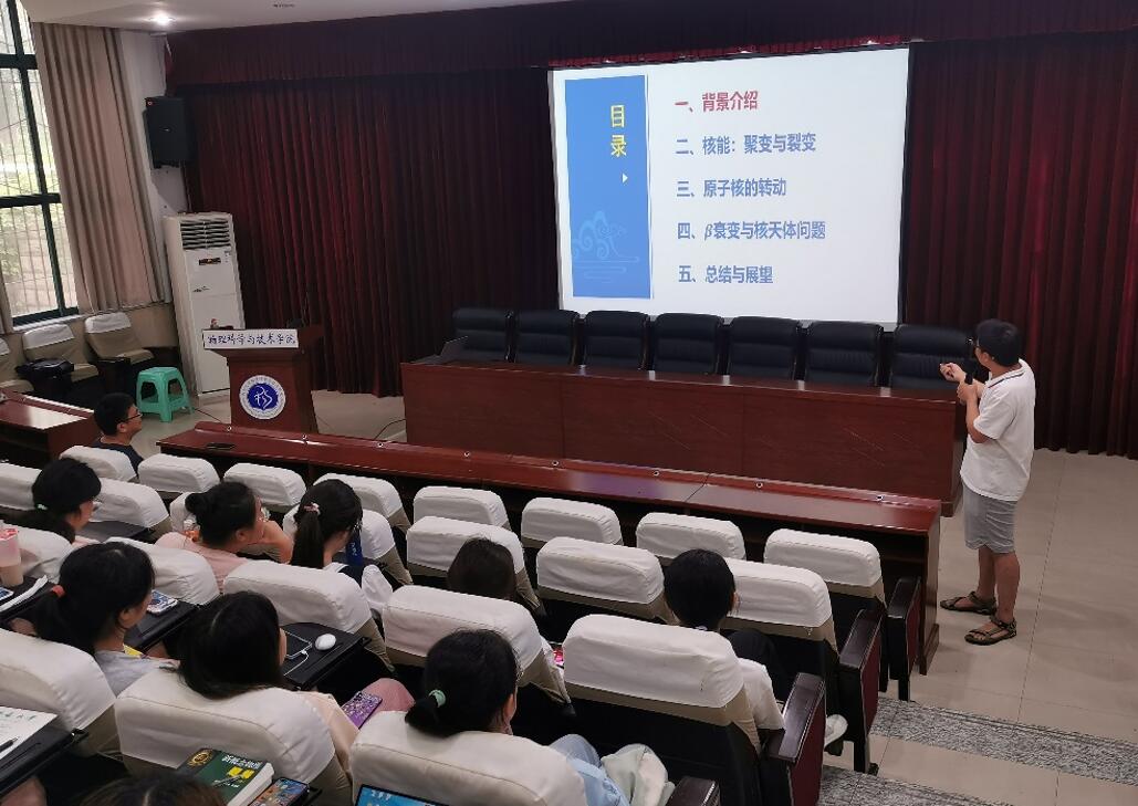 6月8日,第十二期悟理论坛在物理大楼小阶梯教室举行,2021级物理学2班承办此次论坛。本期论坛的主题是“原子核物理与核天体物理简介”,王龙军副教授应邀担任主讲嘉宾,副院长桑文龙、51风流 团委书记贺颖老师参会。