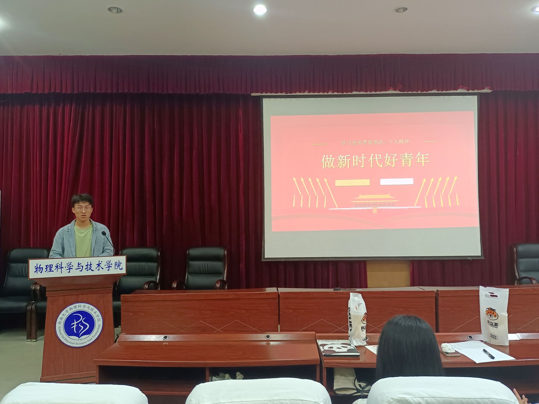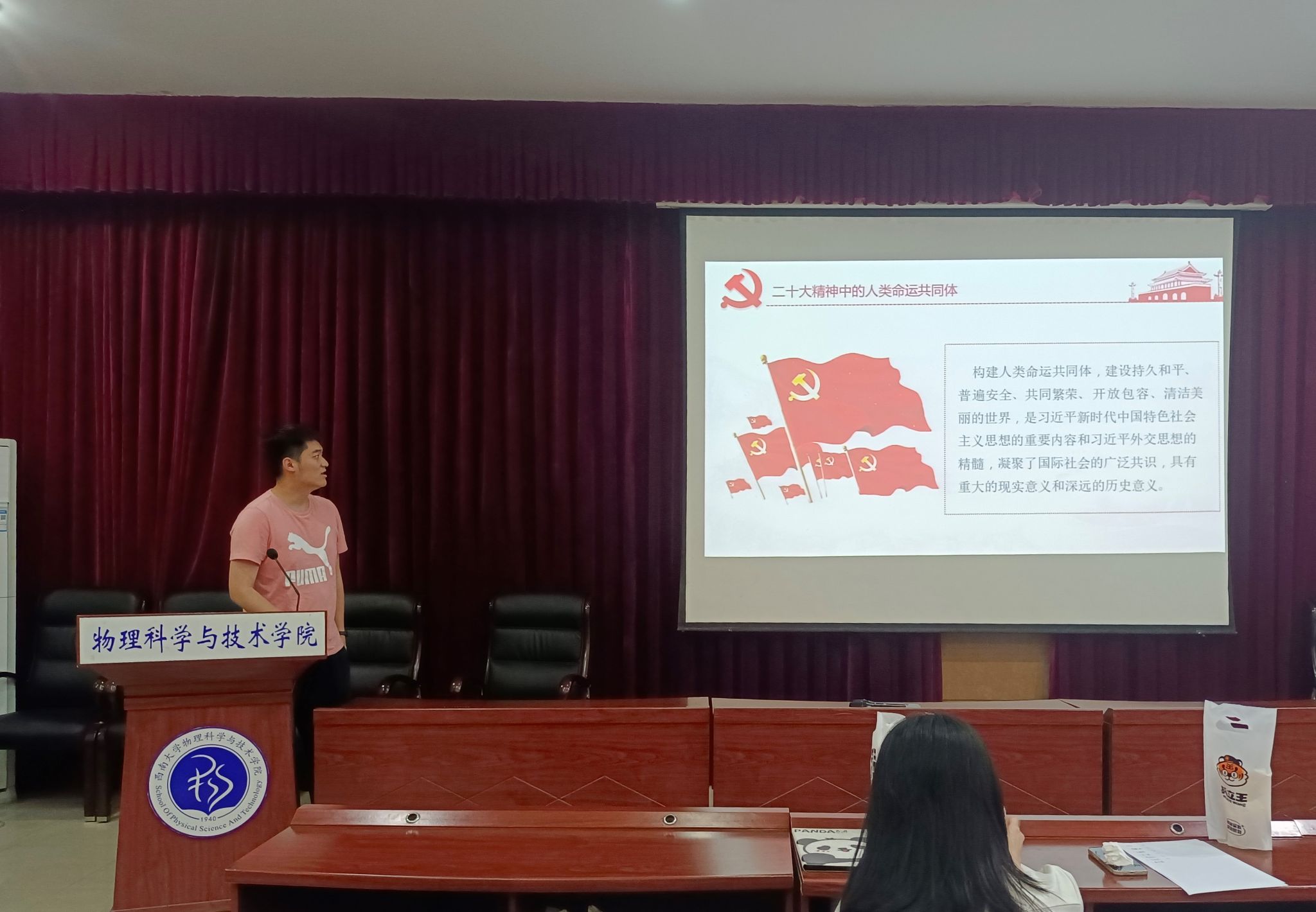 2019级师范2班的杨宇晨同志以“推动构建人类命运共同体的中国担当”为题,讲述了人类命运共同体的丰富意蕴和重大价值,指出新时代青年要努力为人类文明进步贡献智慧和力量;2021级师范2班的吴一诺同志以“坚定文化自信,争做新时代好青年”为题,声情并茂地讲了90后姑娘刘婧和00后少年刘超杰传承中华文化的故事,提出应该为我国的文化自信注入青春力量,青年人应成为文化自信的践行者;2021级师范2班的吴腾晖同志带领大家重点学习了党的二十大报告中有关科教兴国战略的论述,指出大学生应重视创新能力的培养,表示作为师范生走上三尺讲台一定会牢记为党育人、为国育才使命。