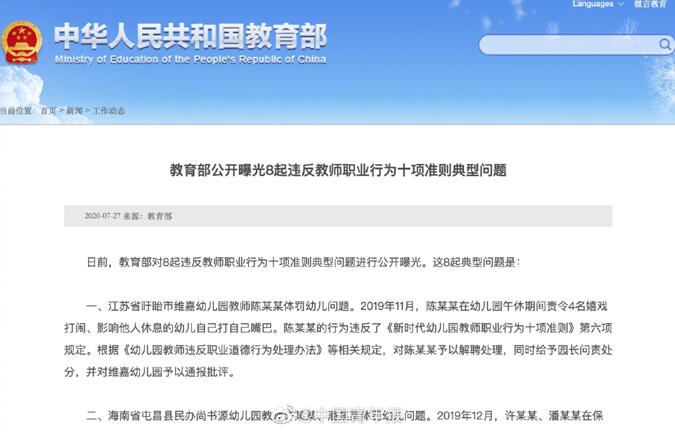 日前,教育部对8起违反教师职业行为十项准则典型问题进行公开曝光。其中包括江苏省盱眙维嘉幼儿园教师陈某某体罚幼儿问题。福州大学实验师张某某性骚扰学生、受贿问题等。 # 对违反教师职业准则行为保持高压态势#