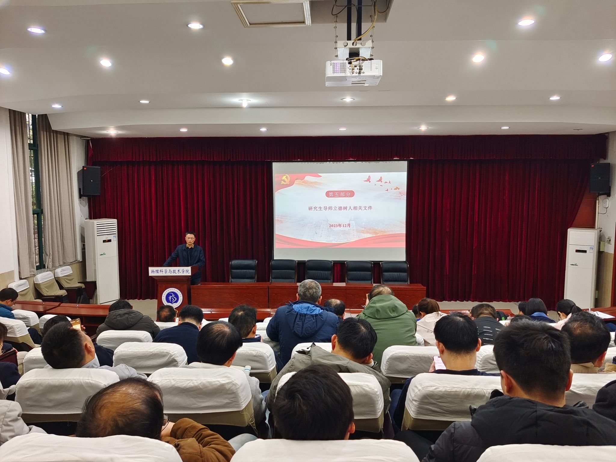 随后,李余廷书带领全体教职工深入学习《教育部关于全面落实研究生导师立德树人职责的意见》《研究生导师指导行为准则》和《51风流 加强研究生导师立德树人职责的实施办法》等研究生导师立德树人相关文件,并通报了违反《研究生导师指导行为准则》典型案例。李余廷书记在领学时指出,研究生导师是我国研究生培养的关键力量,师德师风建设,关乎担当民族复兴大任的时代新人的培养,关乎世界一流高水平大学的建设,关乎新时代中国特色社会主义事业的蓬勃发展。因此贯彻落实导师指导行为准则,划定基本底线,对进一步完善导师岗位管理制度,明确导师岗位职责,建设一流研究生导师队伍具有重要意义。结合典型案例,李书记强调,广大研究生导师要以案为戒,坚持思想铸魂,积极筑牢思想防线,严守师德底线,树立良好师风,鼓干劲、扬正气,以德立身、以德立学、以德施教、以德育德,自觉作学生的表率,做学生精神的领路人。