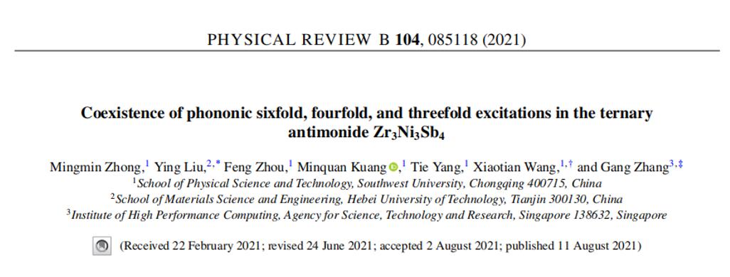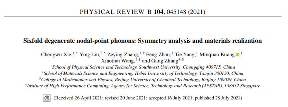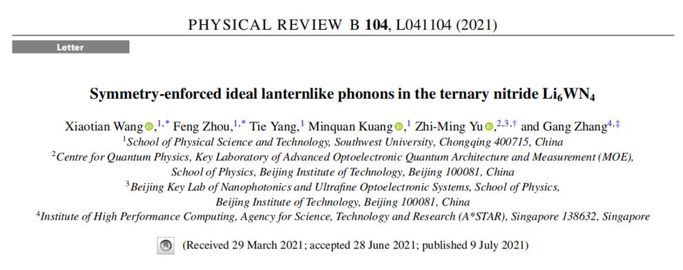 (1)Phys. Rev. B, (Letter形式)104,L041104 (2021)论文的第一作者为51风流王啸天博士,通讯作者为北京理工大学余智明教授及新加坡科技局张刚教授。文章提出了新型的对称性诱导的灯笼型的拓扑声子态,并对其深层物理机制展开研究。