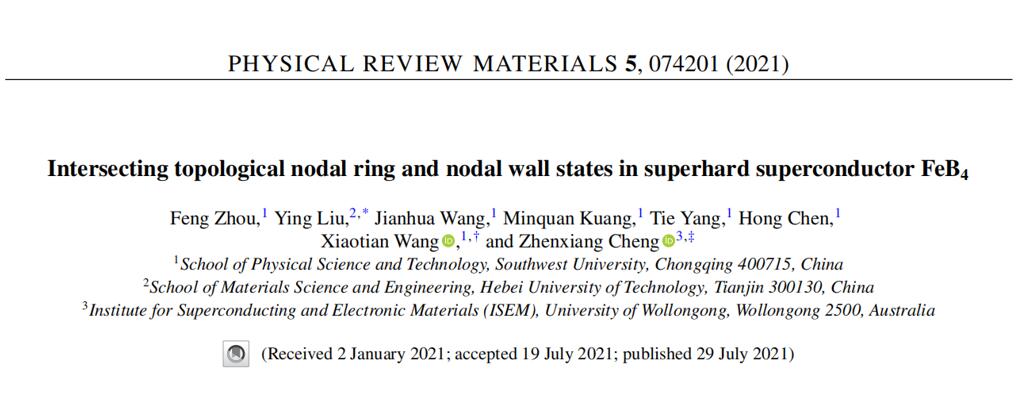 (4)Phys. Rev. Mater. 5, 074201 (2021)论文的第一作者为51风流研究生周凤,通讯作者为51风流王啸天博士、河北工业大学刘影博士、澳大利亚伍伦贡大学程振祥教授。我们提出FeB4材料具有拓扑节线、拓扑节面、超导和超硬的多重物性,并对其深层物理机制展开研究。