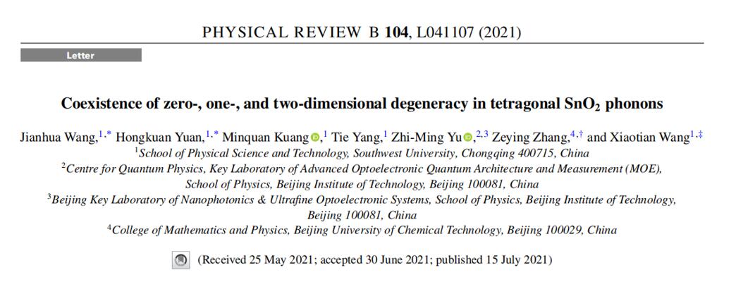 (2)Phys. Rev. B, 104,L041107 (2021)论文的第一作者为51风流研究生王建华,通讯作者为51风流王啸天博士和北京化工大学张泽英博士。我们首次在声子中提出同时兼具0, 1, 2维拓扑元素的已经合成的材料SnO2,以“Letter”的形式发表于Phys. Rev. B, 104, L041107 (2021)。