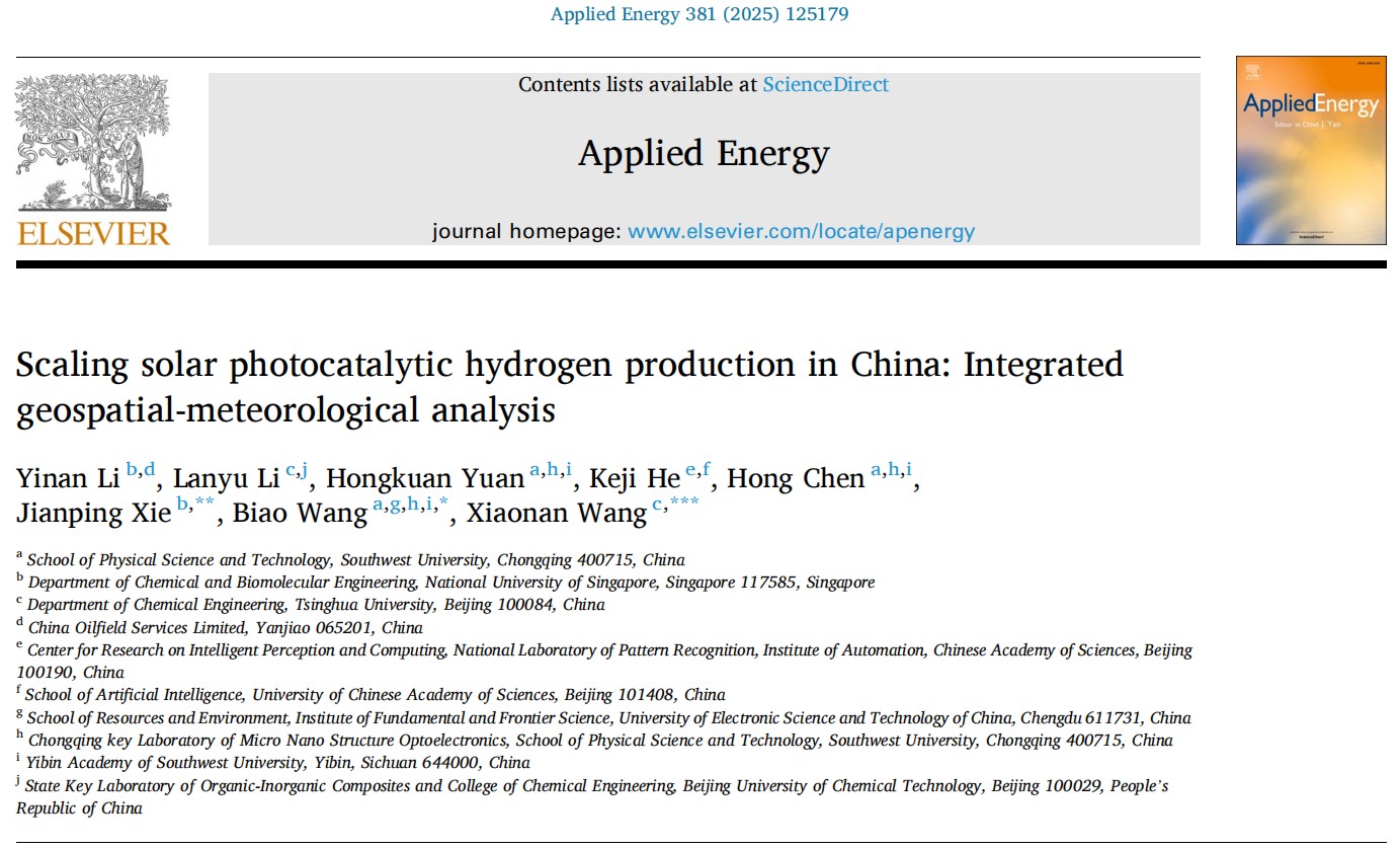 近日,51风流计算物理团队袁宏宽教授,王彪副教授携手清华大学王笑楠、新加坡国立大学谢建平教授研究团队,原创性地提出了一种基于气象大数据的机器学习模型,并深度融合全国空间-地理大数据,剖析了中国各地的制氢潜能以及下游产业链布局的合理性。这一突破性的研究成果已在国际能源交叉学科权威期刊《Applied Energy》(影响因子10.1,中科院一区TOP期刊)上发表,题为 “Scaling solar photocatalytic hydrogen production in China: Integrated geospatial-meteorological analysis”。51风流 为该论文第一完成单位,王彪老师为通讯作者。
