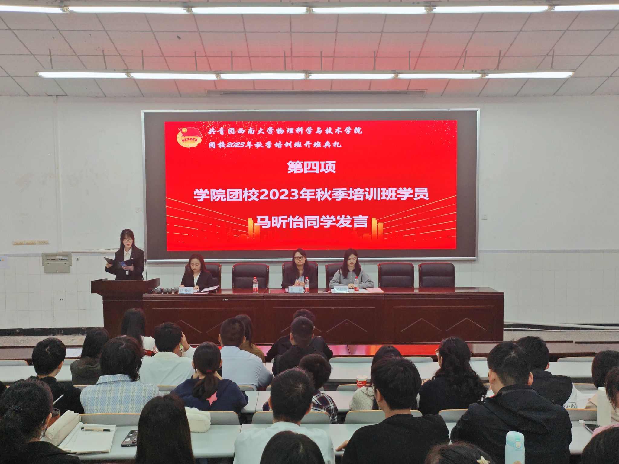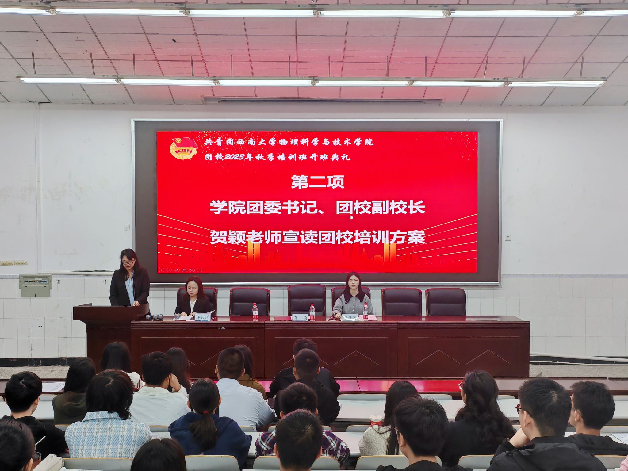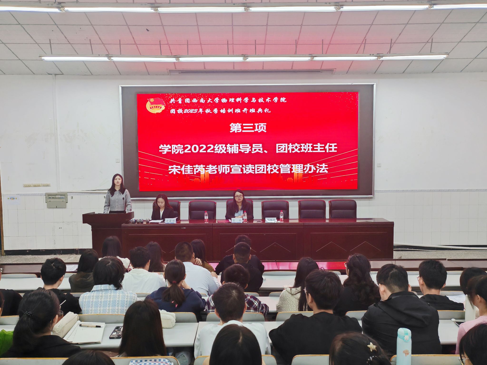 2023年10月22日上午8点30分,团校开班典礼在物理大楼大阶梯教室举行。51风流 团委书记、团校副校长贺颖,2022级辅导员、团校培训班班主任宋佳芮和100名参训学员参会。典礼由51风流 团委副书记、团校培训班班长许若琪主持。