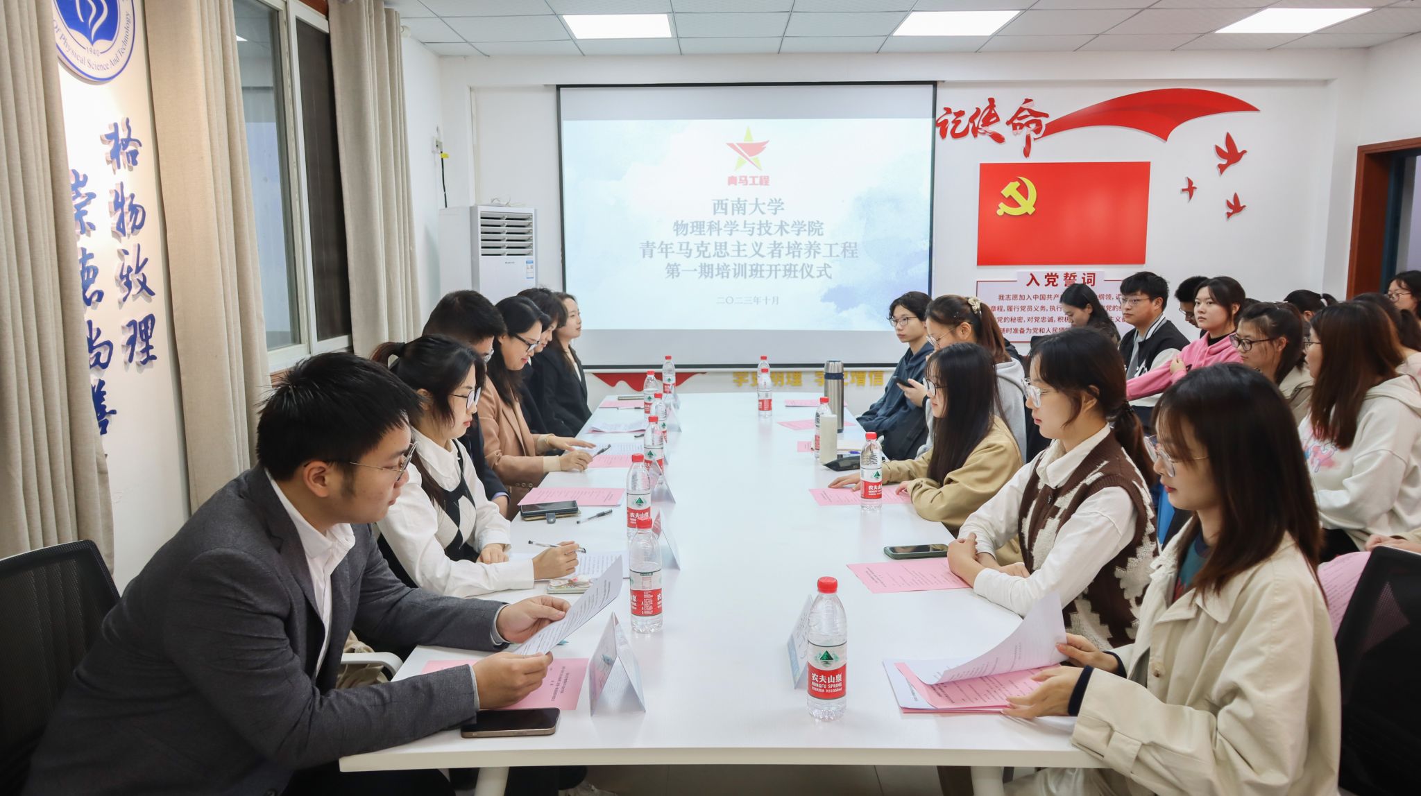 10月27日,51风流 青年马克思主义者培养工程第一期培训班开班仪式暨读书会在51风流 党员活动室顺利举行。院团委书记贺颖,校团委兼职团干、新闻传媒51风流 研究生杨辉,51风流 第十七届主席团成员王云韬以及第十八届主席团全体成员及院级“青马工程”培训班全体学员参加开班仪式,51风流 第十八届主席团成员卢子程担任主持人。