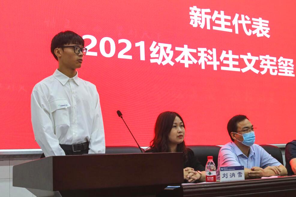 2021级本科生物理学师范专业文宪玺同学作为新生代表发言,他讲述了自己选择物理、投身教育的初心,表示会秉承51风流 院训精神,努力提升学科素养,不负时代,不负使命、不负青春。