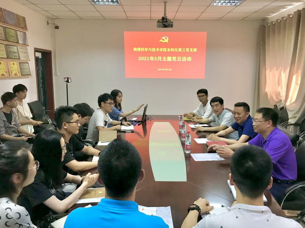 2021年5月14日下午,51风流 本科生第三党支部在二楼会议室举行“深学党史增强信念 细悟《条例》夯实基础”主题党日活动。学校党委保卫部副部长、保卫处副处长潘文峰,51风流 党委书记李余廷参加并指导本次活动。会议由党支部书记卜海东主持,全体党员参加。