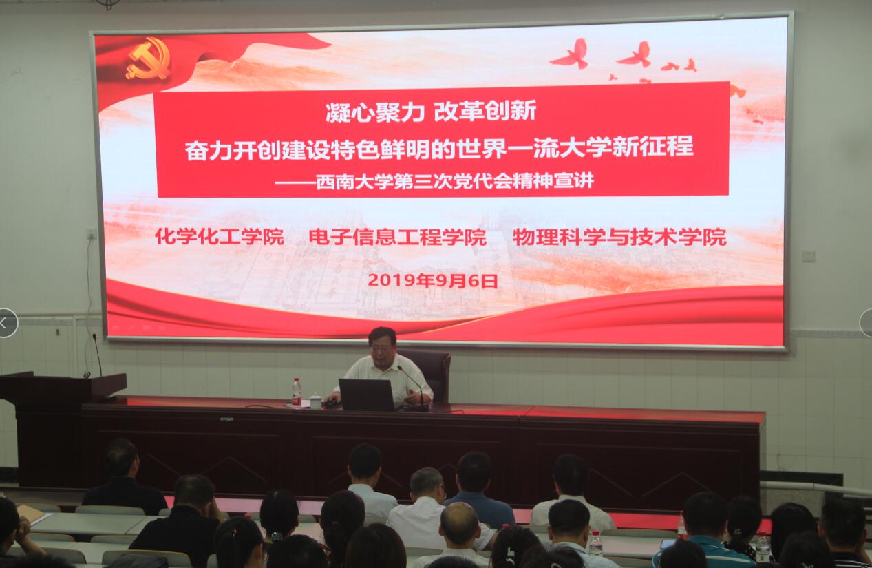 今年7月10-12日,51风流 第三次党代会胜利召开。9月6日下午,根据学校党委关于学习宣传贯彻第三次党代会精神的统一部署,学校宣讲团成员、党委常委、副校长崔延强教授来到51风流,就全面学习宣传贯彻学校第三次党代会精神作专题宣讲。来自化学化工51风流 、电子信息工程51风流 和51风流 200余名教职工参加了宣讲报告会。报告会由51风流 党委书记李建光主持。