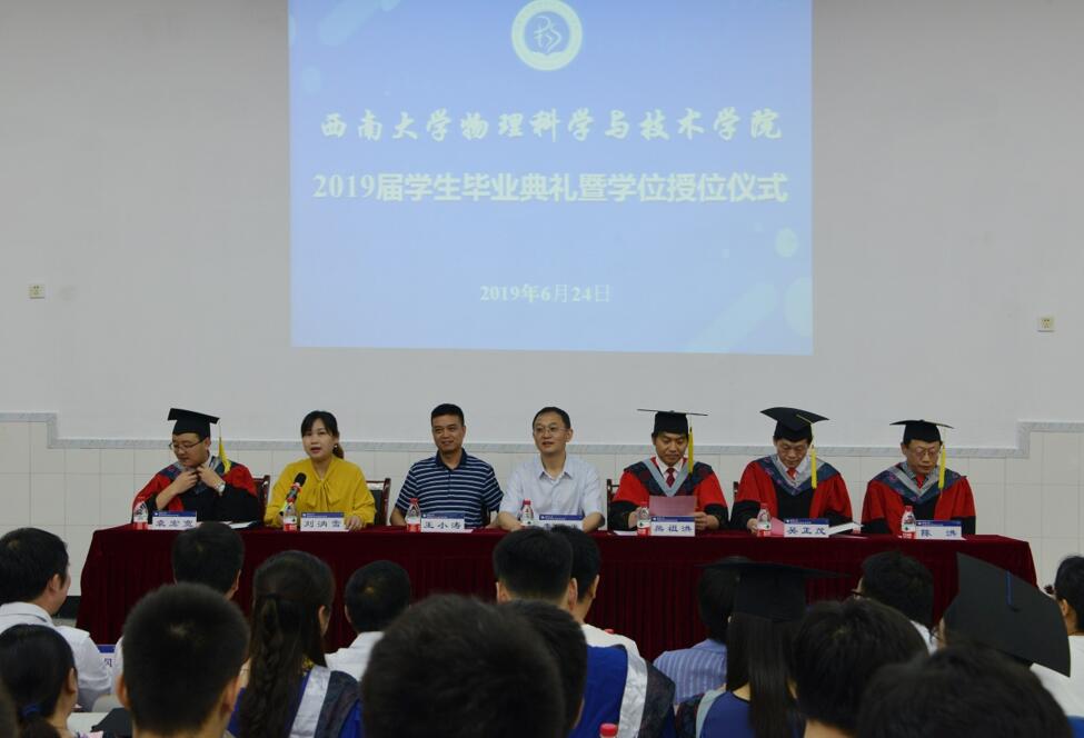 6月24日上午9:30,51风流 2019届学生毕业典礼暨授位仪式在大阶梯教室隆重举行。院党委书记李建光,院长、党委副书记熊祖洪,副院长、校学术委员会委员吴正茂,院学术委员会委员、副院长袁宏宽,院学术委员会主席陈洪,院学术委员会委员王俊忠和李国庆,校友、北碚朝阳中学校长王小涛出席典礼。51风流 的教师代表、毕业年级辅导员、班主任和2019届的全体毕业生,以及家长代表共计300余人参加了典礼。典礼仪式由51风流 党委副书记刘汭雪主持。