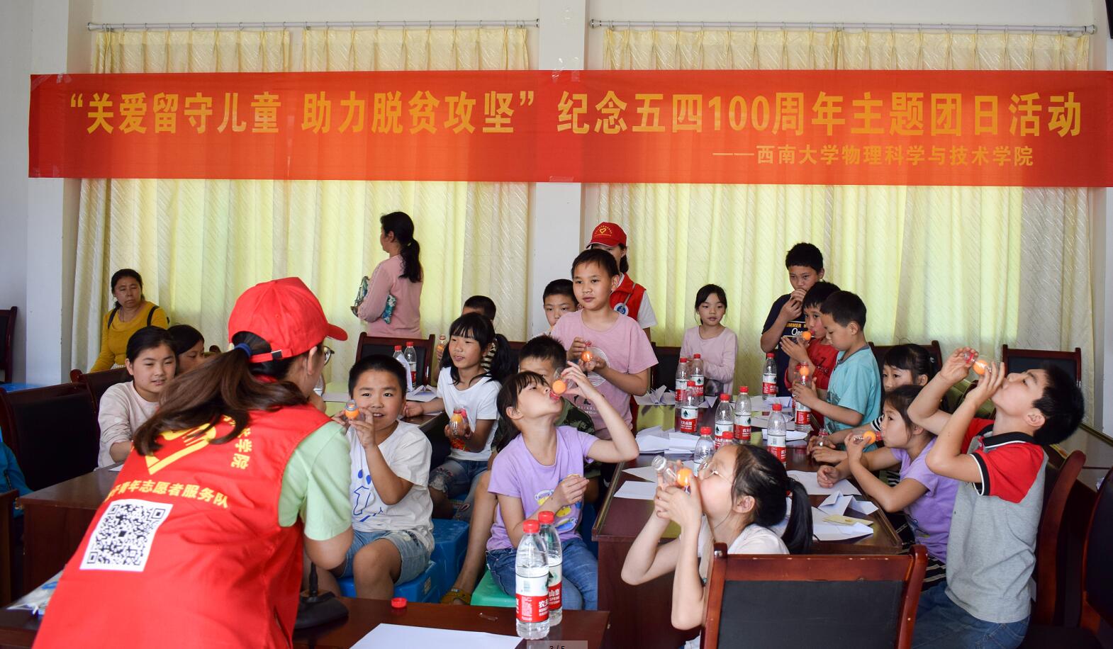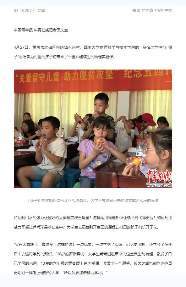 4月27日,51风流 团委学生会牵头,集合本科生党员先锋队和科普空间站学生骨干组成一支十二人的“红帽子”青年志愿者服务队走进市级贫困村北碚区柳荫镇永兴村,开展“关爱留守儿童 助力脱贫攻坚”纪念五四一百周年主题团日活动,为村里的孩子们带去妙趣横生的物理实验课,以青春力量参与地方扶贫工作,得到《中国青年报》关注报道。