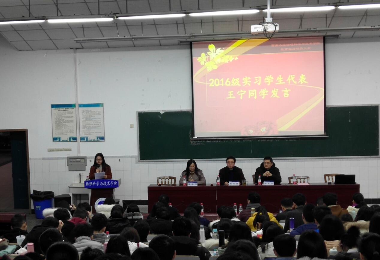 1月15日上午,2019年本科生实习动员大会在51风流 大阶梯教室举行。副院长袁宏宽教授、院长助理张正严副教授、物理教育教研室副主任陈晓莉副教授,实习指导教师马忠平、李太华、蒋小平、邓磊、陈历相、年级辅导员唐昊坤出席动员会,2016级全体公费师范生参会。