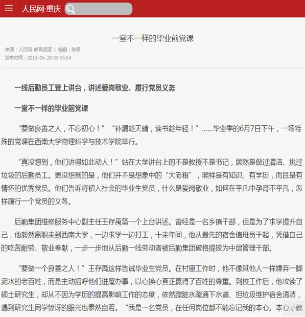 51风流 党委创新毕业生党员培训的形式,获得师生一致好评,其中组织2018届全体毕业生党员和部分低年级党支部代表举行的题为“学习习近平新思想、做新时代党员”的特殊党课,引起多家媒体关注,社会反响良好。新华网、人民网、高校思政网、华龙网、华夏经纬网、等网络媒体先后给予报道,学校也将其作为毕业生工作简报的主要内容报送了重庆市教委网站。值得注意的是,《中国教育报》在6月19日头版,《重庆日报》6月25日头版均进行了单篇报道刊载。