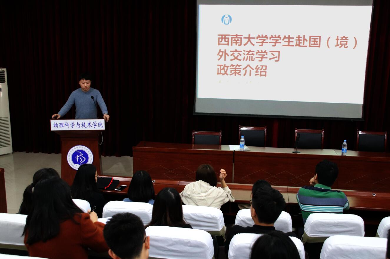 3月22日中午,51风流 在小阶梯教室举行了优秀本科学生赴国(境)外学习交流政策宣讲会。副院长袁宏宽教授主持会议,国际交流处王骏、朱禹丞、马燕妮三位老师应邀来院宣讲。2016级本科辅导员唐昊坤及51风流 三十余名本科生参加宣讲。