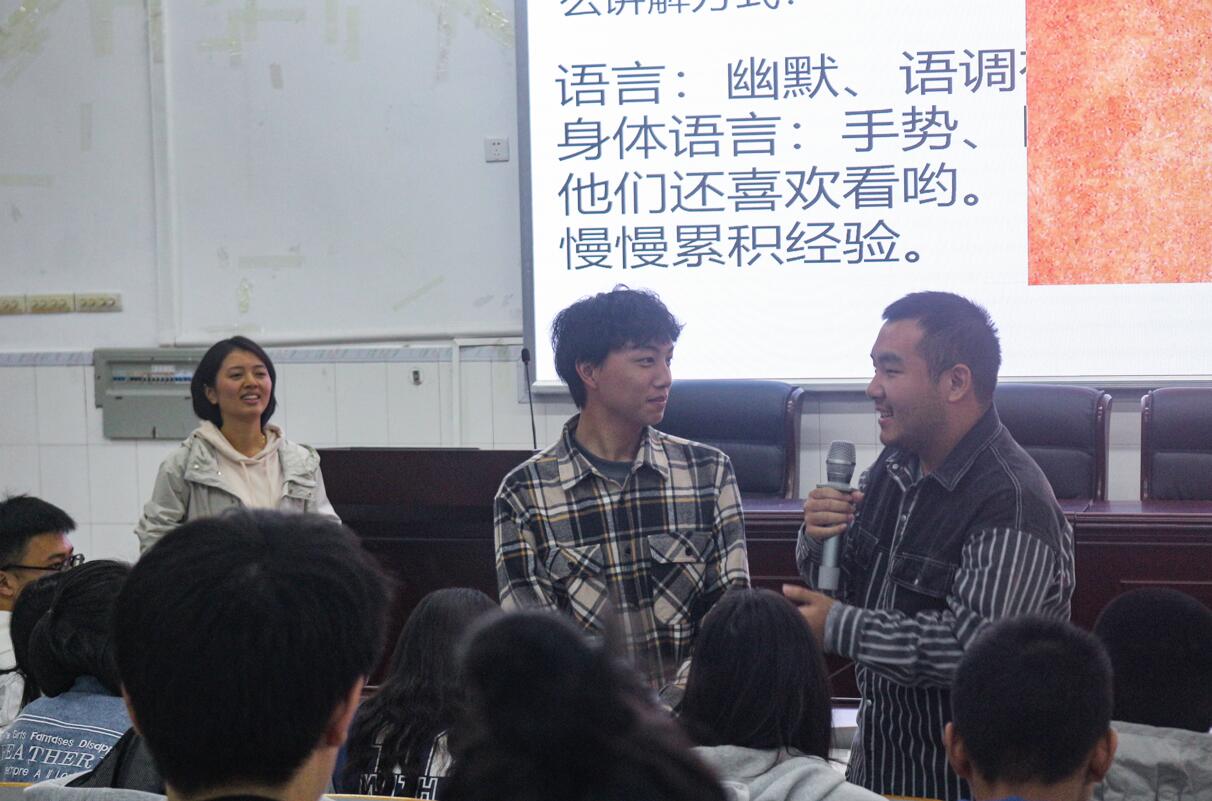随后,康老师举例展示了可设计研发的科普内容,如简易太阳能热水器、纸杯飞行器等,详细介绍了科普教学设计的流程和重点。现场抽取两组同学,以滴水计时器为例模拟了科普讲解场景。最后,康老师建议同学们应多渠道提升自身科学素养,定期参观学习科技馆博物馆扩宽眼界,加强跨院系交流,查阅文献资料积累科普素材,形成学科融合的教育思想。