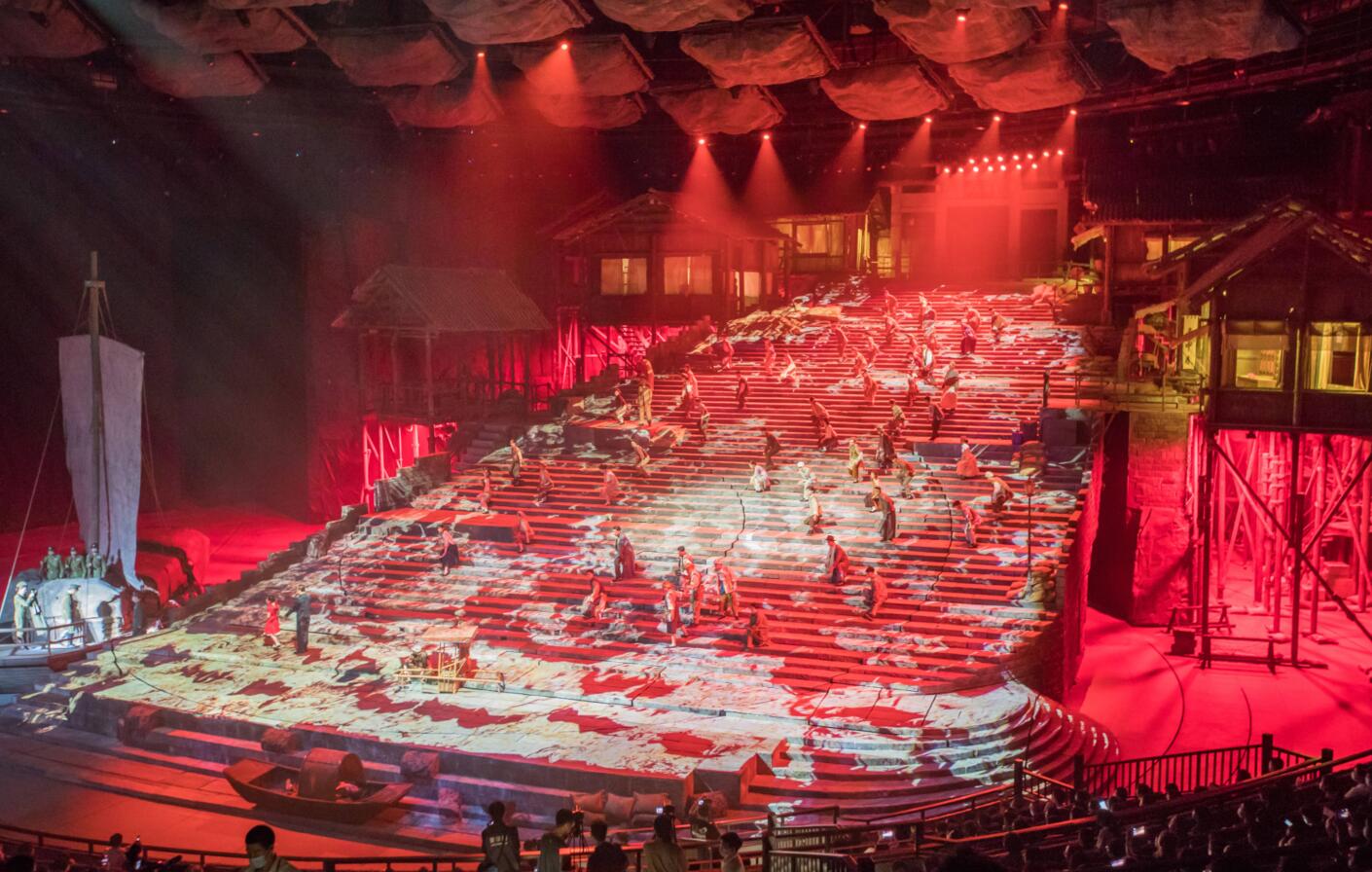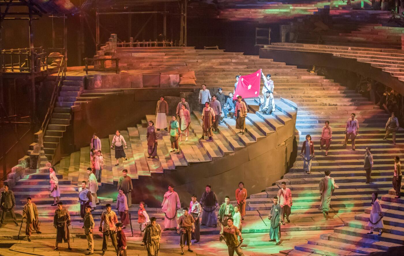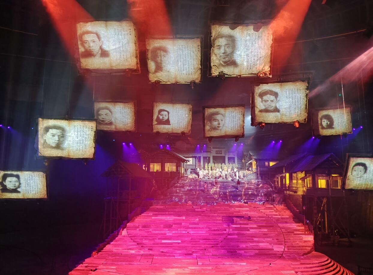 这场“弘扬红岩精神,传承红色基因”的红色历史大剧共分七幕,分别为《嘉陵江的暗流》《意志的考验》《心中的国旗》《无悔的抉择》《传不出去的情报》《坚定的信仰》《燃烧的理想》。演出正式开始,悠远而又颇具历史感的背景音乐在耳边响起,舞台灯光也瞬间亮了起来,整个舞台伴随音乐一起缓缓旋转。就在灯光亮起的那一刻,吊脚楼建筑群、石阶与牌坊、巨轮扬帆、磁器口码头、监狱哨岗和铁牢等实景再现,整个舞台随着空间的旋转交错,3D动态全景音画、智能灯光的烘托,再凭借高科技的舞台表现手法带领着观众仿若在瞬间穿越回到黎明前的“山城”,时而带领观众穿过狭窄的街巷,时而又面对汹涌的嘉陵江……回望那段悲壮而又令人肃然起敬的历史,大家被深深地震撼到了。以《红岩》《江姐》等小说,以及渣滓洞、白公馆为背景的红岩魂故事情节深深地感染着大家,仿佛回到了72年前的重庆,看到了被关押在渣滓洞、白公馆的共产党人、民主人士选择坚守信仰、不惜牺牲的果敢和对未来的希望,看到了重庆地下党营救狱中同志、保护重庆重要设施展开的殊死搏斗。舞台有节奏地旋转,场景的不断变化,大家沉浸在这熟悉又陌生的场景中。