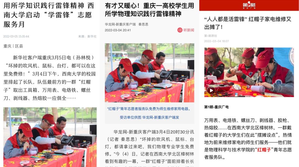 学雷锋,见行动,立风向。“红帽子”发源于原西南师范大学物理系60年代初成立的“学雷锋服务小组”,现在有青年志愿者服务队和本科生党员先锋队两支队伍,每年都会进社区、学校等开展十余次志愿服务活动。3月5日“学雷锋纪念日”当天到龙凤桥街道燎原社区的义务维修活动也是深受居民喜欢的项目。