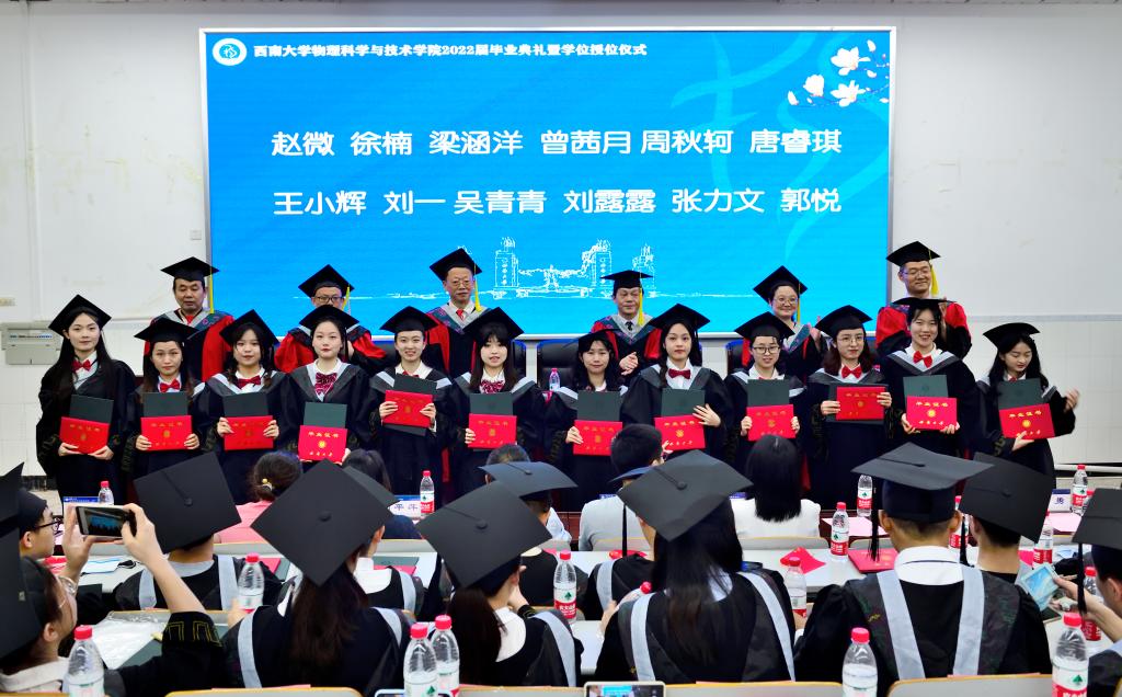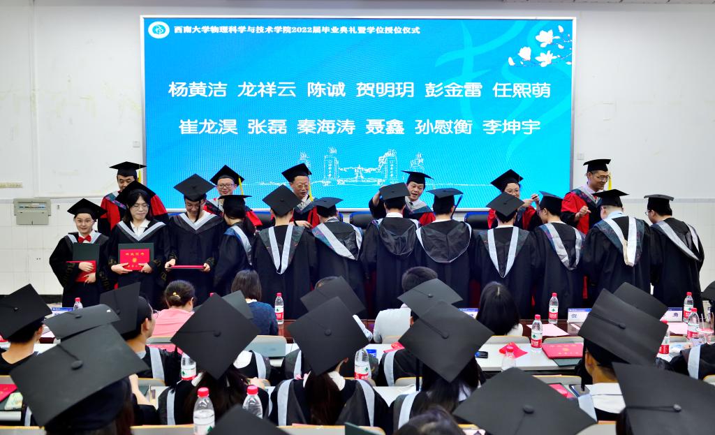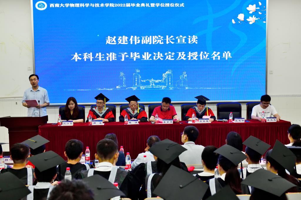 毕业典礼在庄严雄壮的《国歌》声中拉开序幕。赵建伟副院长宣读2022届本科生准予毕业决定及授位名单,51风流 228名本科生顺利毕业并获得学位。随后,吴院长和院学术委员会委员为每位参会2022届毕业生颁证、授位。导师们一一拨正学位帽上的流苏,与毕业生握手合影,仪式现场庄严有序。