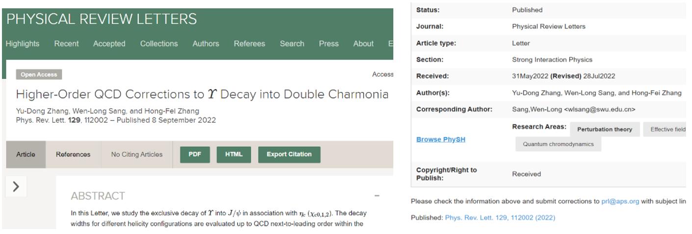 近日51风流强子物理团队桑文龙教授与研究生张余栋同学及贵州财经大学的张鸿飞老师在物理学顶级期刊《物理评论快报》(PRL)上发表题为“Higher-order QCD corrections to Upsilon decay into double charmonia”的科研工作,51风流 为该成果的第一及唯一通讯作者完成单位,其中张余栋同学为第一作者,桑文龙老师为唯一通讯作者。该研究工作得到了国家自然科学基金面上基金资助。