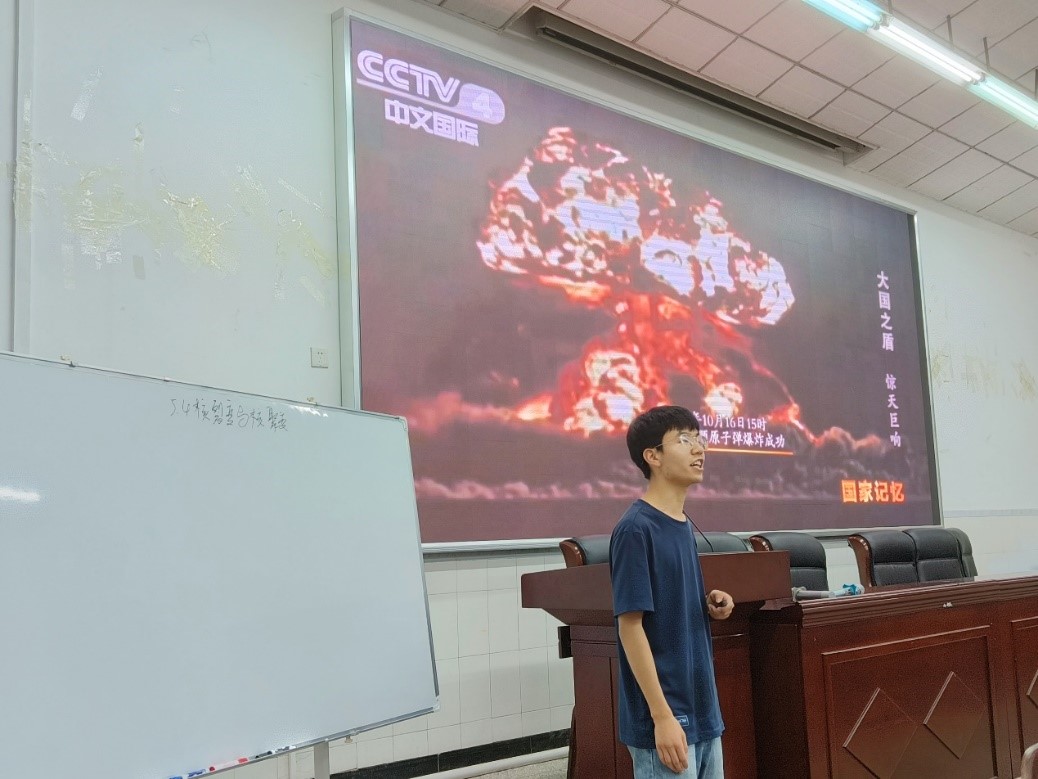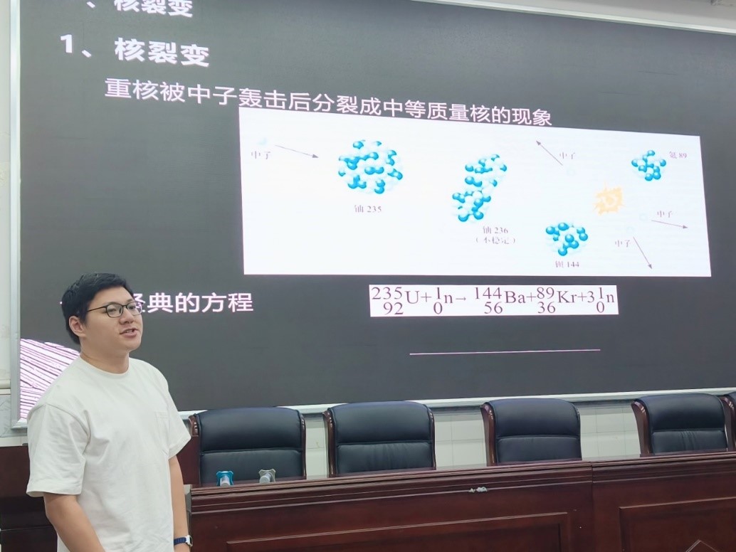 来自师范一班,在51风流 附属中学实习的吴天富同学用“大国之盾——原子弹”作引入,为大家讲解核裂变的同时更激发着同学们的爱国情怀。