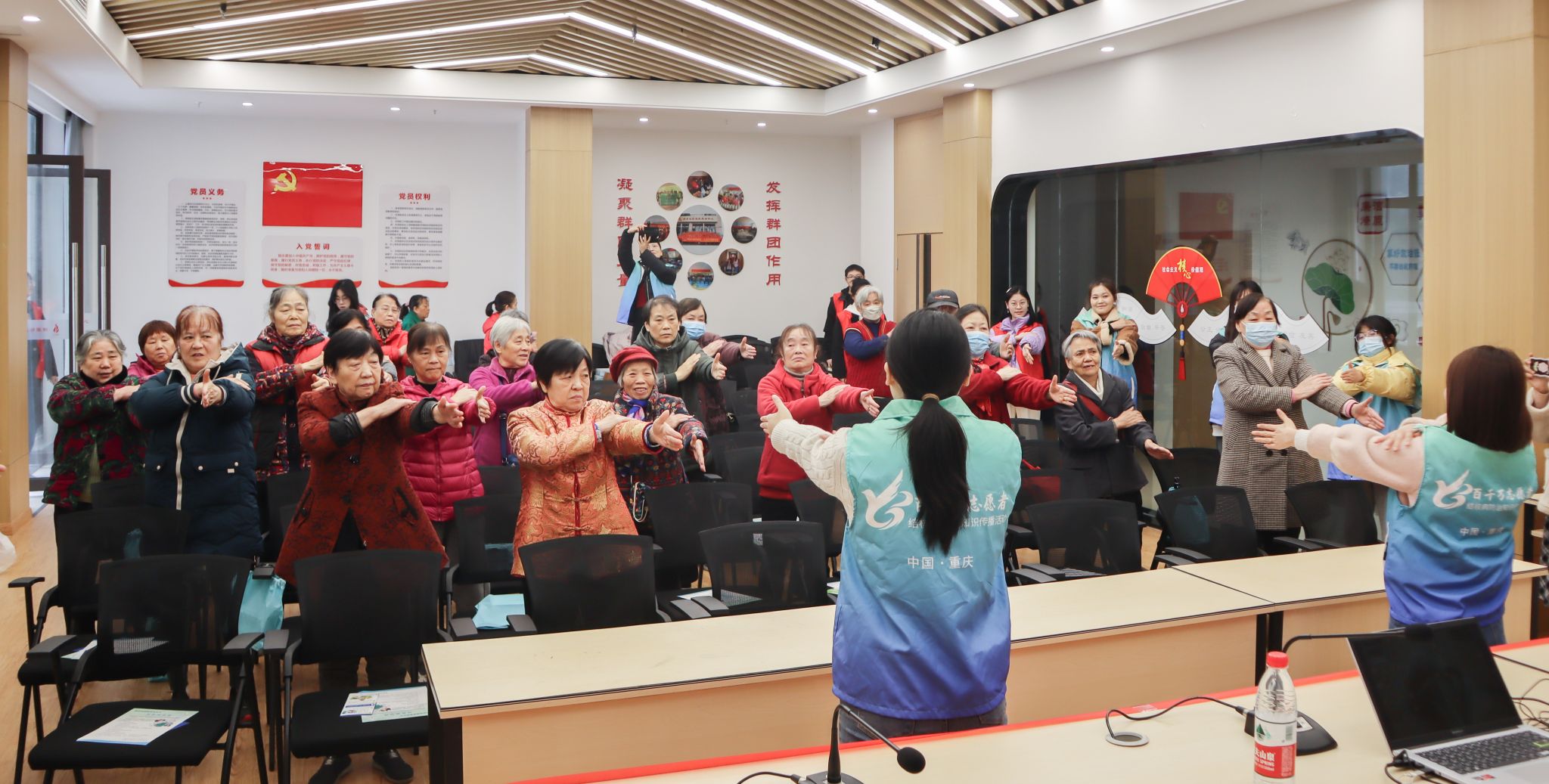 杨丹老师带领居民们齐做改善肺功能的肺力操,音乐节奏轻快,现场氛围活跃,学生志愿者们耐心及时帮助大家纠正动作。