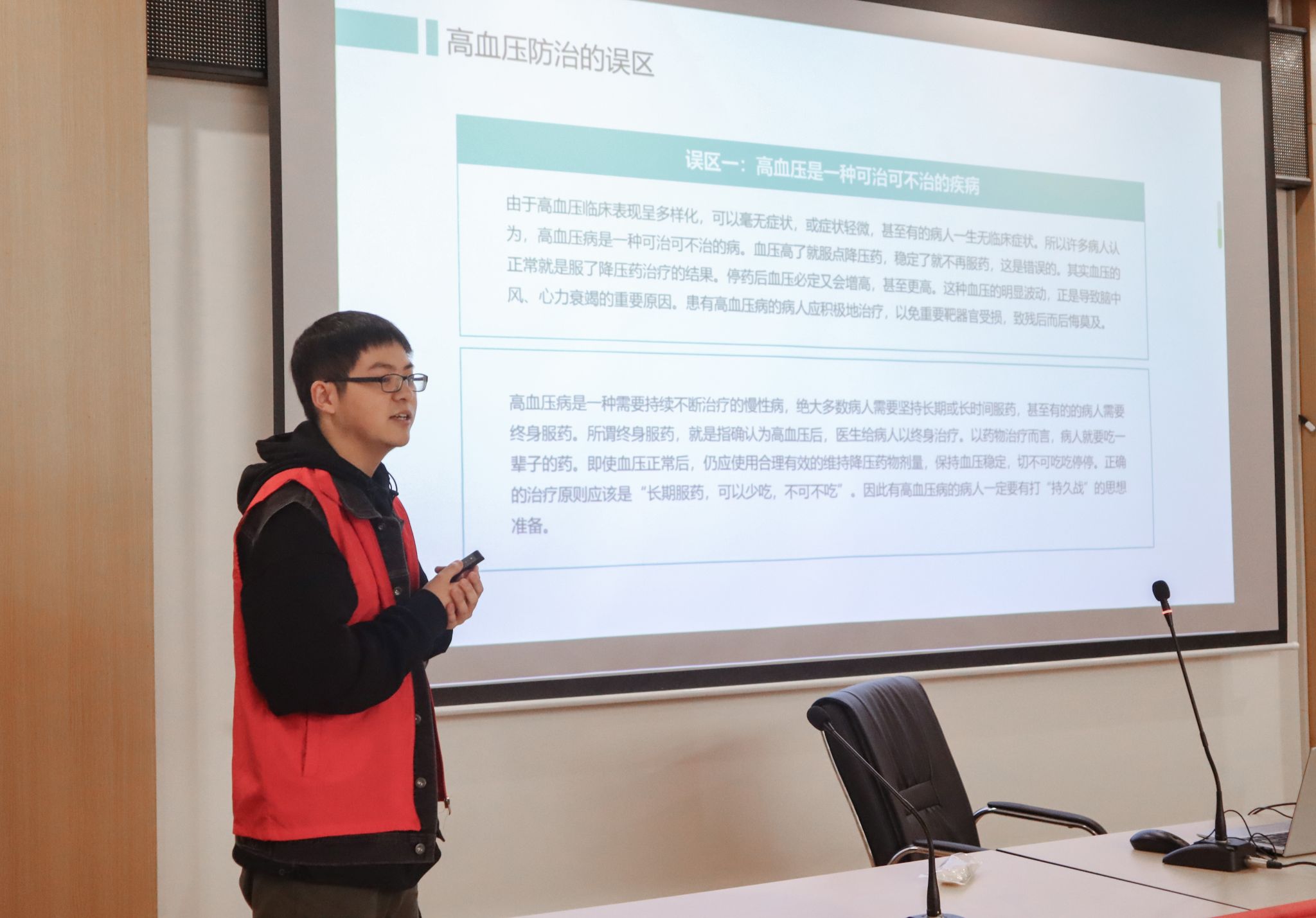 “红帽子”志愿者童柏凯同学进行了高血压诱发因素、预防和治疗知识的宣讲,重点强调了高血压的常见误区,提醒大家谨遵医嘱,科学用药。