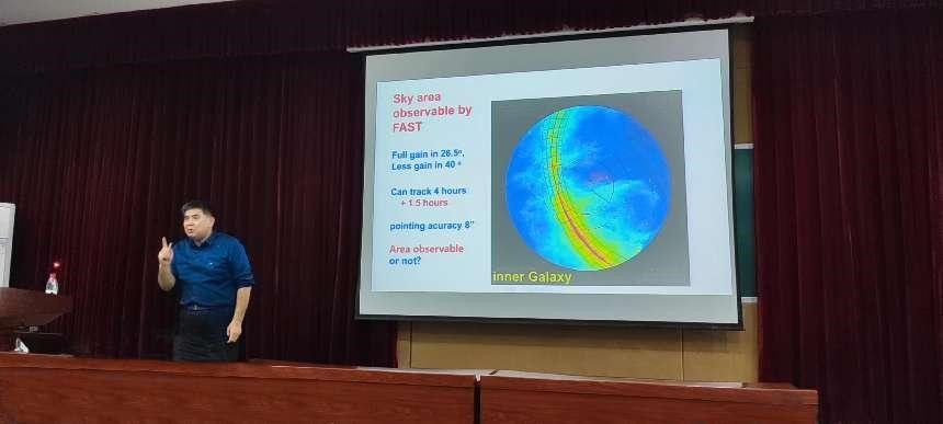 韩金林教授首先介绍了脉冲星的基础理论:脉冲星是旋转的中子星,以一个接一个脉冲的方式辐射射电波并穿越星际介质。在过去的55年里,世界各地的射电望远镜已经发现了3000多颗脉冲星。然后介绍了近年来我国建造的国家级项目FAST(五百米口径球面射电望远镜,也称天眼),在过去的5年里,韩金林教授团队用它来对银河系平面进行巡天观测,已经发现了730多颗脉冲星,其中包括170颗在双星系统中的脉冲星。还发现了一些具有强相对论效应的双星系统,以及8个源自银河系外的快速射电爆源。