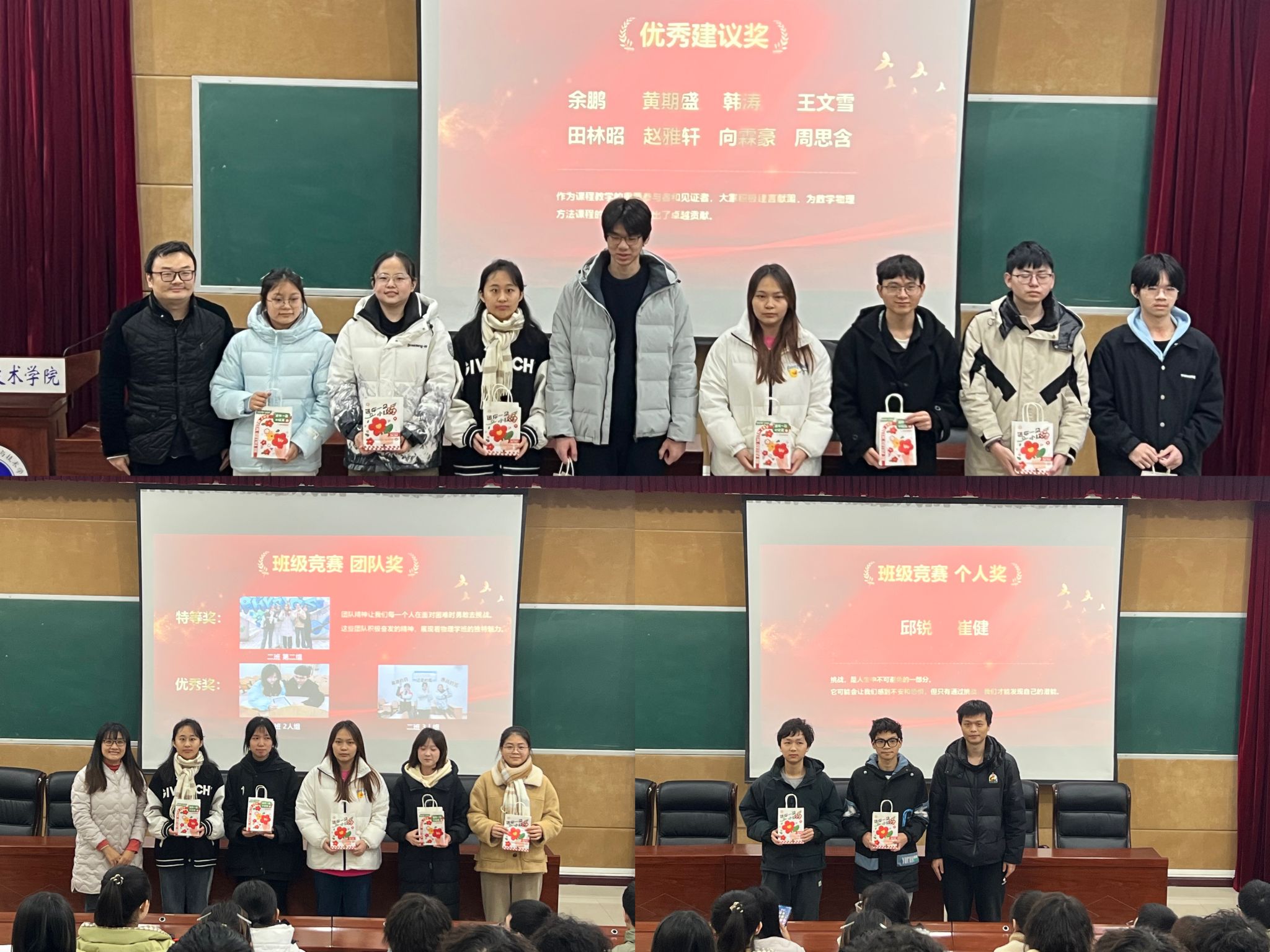 结课仪式上,51风流 党委副书记娄霞、副院长游霄鹏、2023 级辅导员贺颖老师和班主任朱华星老师共同见证了同学们的荣光时刻。本次仪式共设置了九个奖项,包括 “学习能手”“最佳风采”“勤奋好学生”“进步之星” 等,表彰在学习和课程活动中表现突出的同学。36 位获奖者依次上台领取秦老师亲手准备的五彩斑斓的糖果和点心。