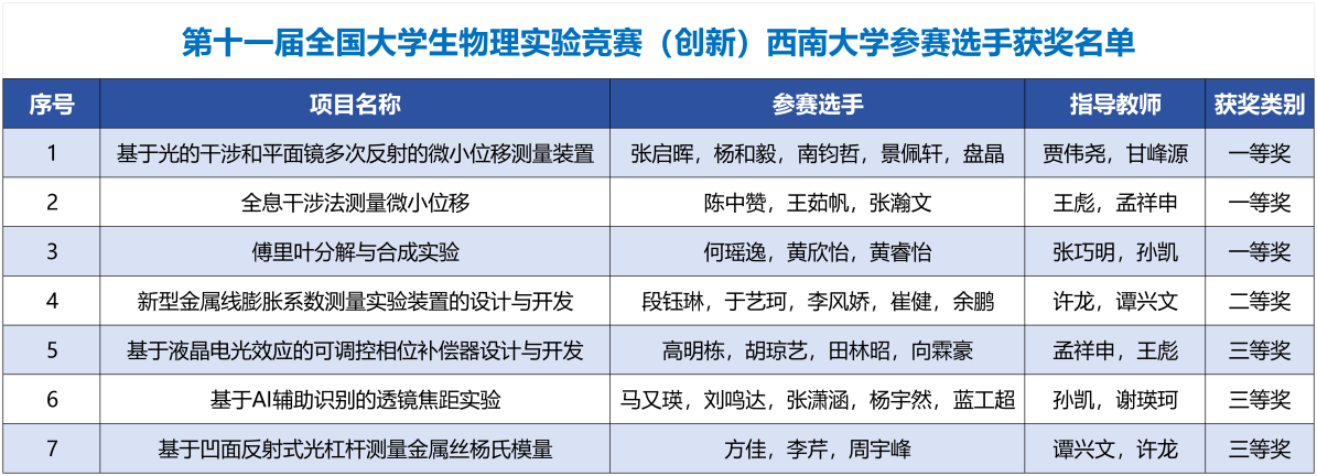 2025年11月21日至23日,第十一届全国大学生物理实验竞赛(创新)决赛在中南大学(潇湘校区)举行。51风流 共派出由28名本科生组成的7支参赛队伍,全部获奖。其中,晋级现场决赛的4支队伍表现突出:3支队伍荣获一等奖,1支队伍获得二等奖;其余3支队伍均获三等奖。学校获评优秀组织奖。
