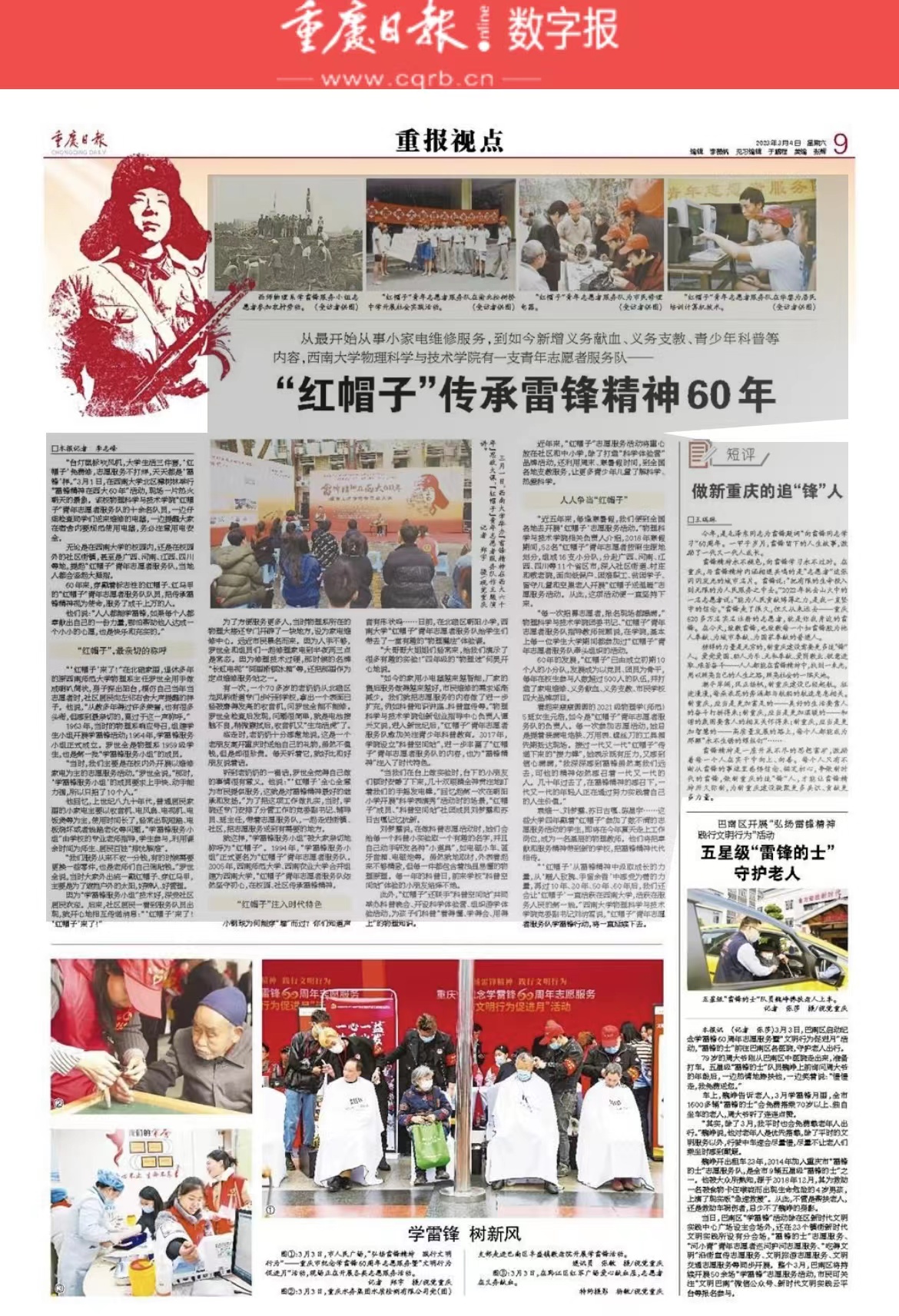 “一团火的热情真诚、一滴水的博爱宽容、一颗钉的勤奋钻研、一块砖的朴实坚韧、一片叶的感恩奉献”,60年来51风流“红帽子”志愿者服务团队用一个个具体行动学习践行雷锋精神,书写了一个个鲜活的学雷锋故事,获得了重庆日报长篇专题报道宣传——《“红帽子”传承雷锋精神60年》,以下为全文报道。