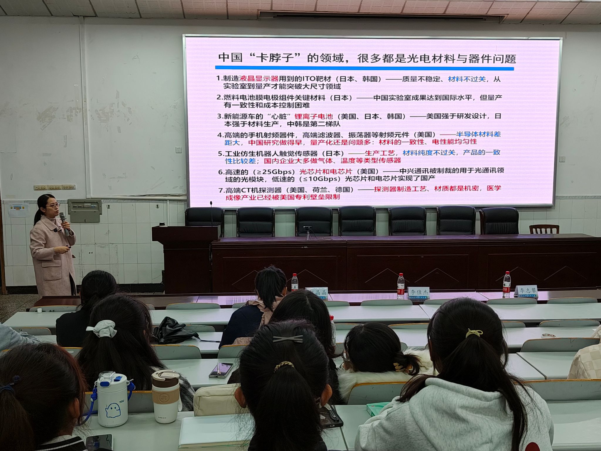 赵晶晶老师从国家战略发展趋势出发,指出科技工作者要坚持“四个面向”加快科技创新,指出我国卡脖子技术很多都是光电材料与器件问题。随后,她介绍了自己的科研团队主要从事钙钛矿x射线探测器和钙钛矿太阳能电池的研究,结合实例说明了x射线探测器的未来发展和产业化应用——便携式探测成像。最后她建议本科生要了解不同的研究方向、要善用周边的教学资源以及开始阅读论文文献。