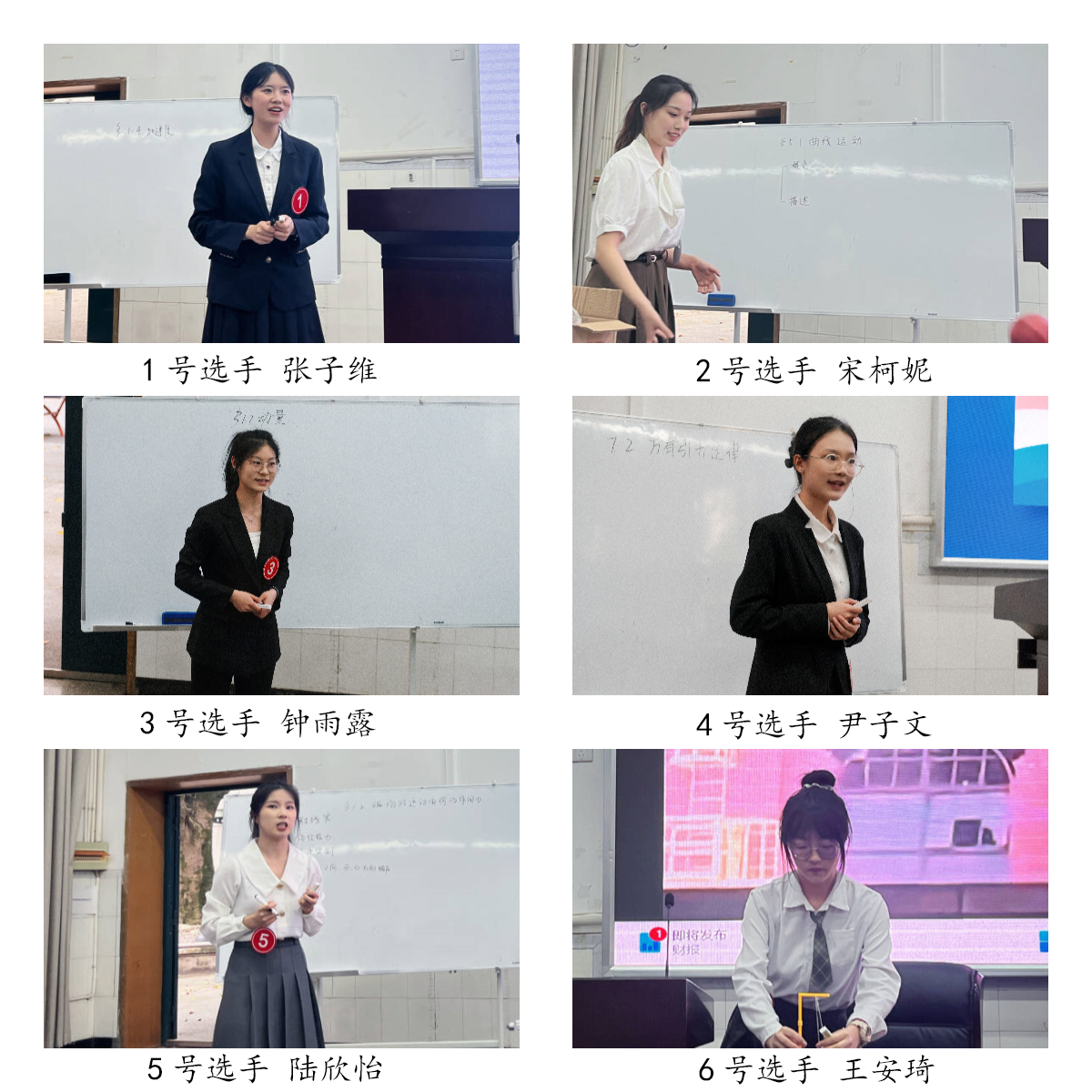 张子维同学用飞机起飞和运动员起跑做对比,引入加速度概念,语调抑扬顿挫,颇具感染力。宋柯妮同学用自制的教具将曲线运动可视化,课堂紧凑完整。钟雨露同学用大运会的例子介绍了动量概念以及其性质,教学环节环环相扣。尹子文同学生动的介绍了行星与太阳间的引力及规律。陆欣怡同学引入极光现象对洛伦兹力进行了详细阐释。王安琦用铁锤拆房子的事例形象地展示了能量之间的转化。六位选手精心设计教学内容,在理论讲解的同时兼顾实验演示和现场互动,课堂氛围积极活跃。