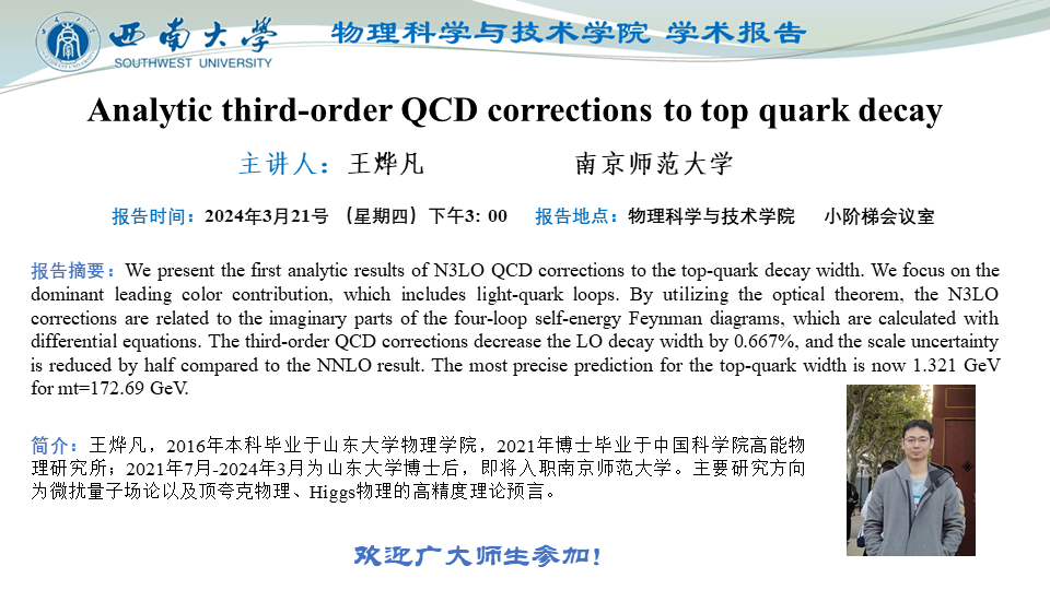 【学术报告】Analytic third-order QCD corrections to top quark decay