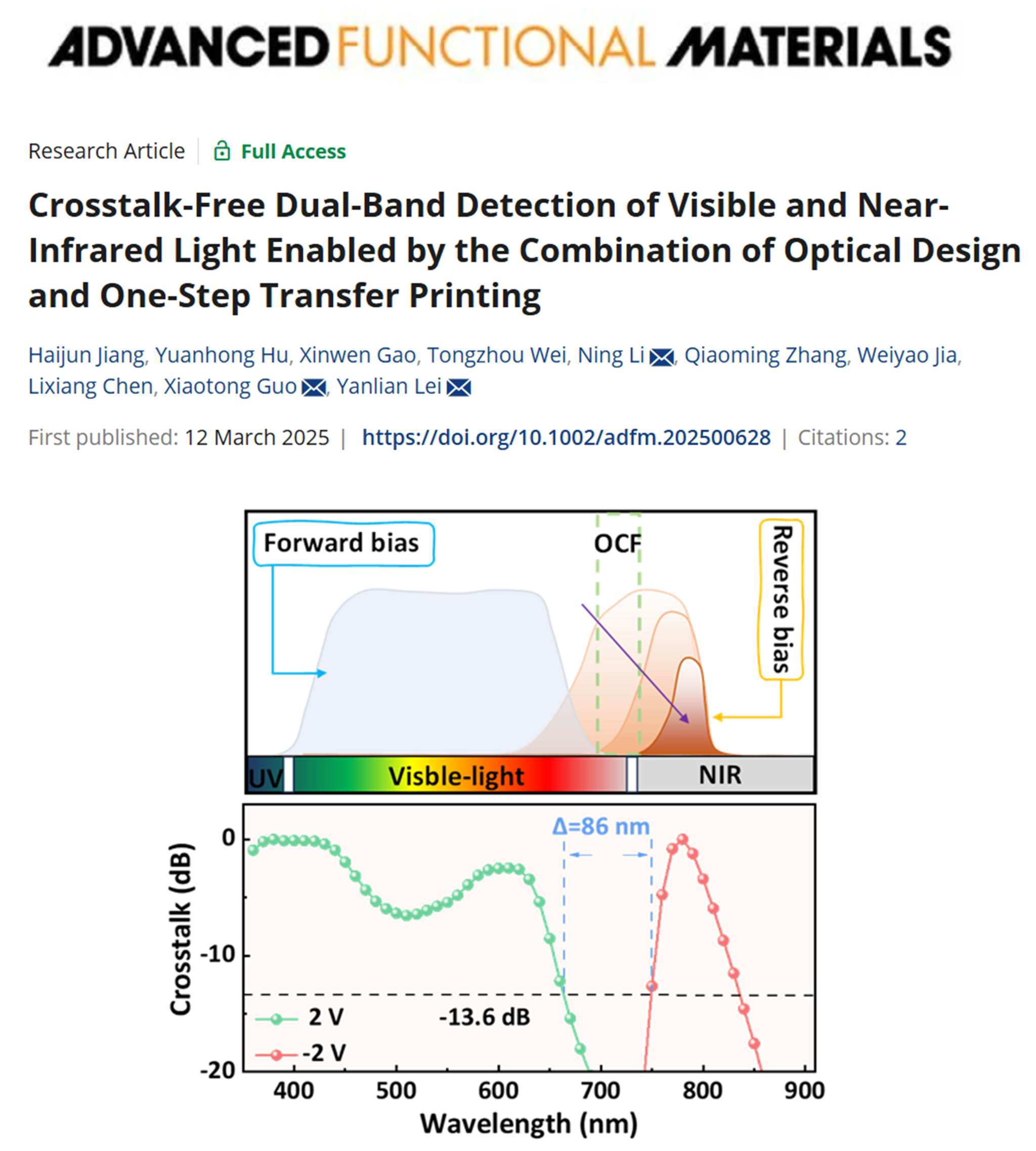 光学串扰会对图像识别和光通信等应用中的检测精度产生不利影响,是传统双波段光电探测器面临的一个关键挑战。针对这一问题,团队提出了一种通过垂直背靠背堆叠结构来消除双波段有机光电探测器中光学串扰的有效策略。该策略将用于短波长(可见光)吸收的异质结置于前侧,而用于长波长(NIR)吸收的异质结置于后侧。与以往通过增加前端单位厚度或增加光学间隔层的方法不同,团队利用一步转印方法增加后侧NIR吸收层的厚度。该技术不仅克服了溶液法制备有机厚膜的技术难题,还实现了双波段探测器中无串扰的光响应。基于器件内光场分布优化和电荷收集窄化机制,有效滤除了的短波长光的信号干扰,从而实现了在正向偏压下可见光和在反向偏压下窄带NIR光的独立检测。更重要的是,该方法适用范围广,不需要对吸收层进行特殊选择或设计,并成功验证了其在抗干扰信号检测和光通信中的应用,为未来开发无光学串扰多模光电器件提供了新思路。以上结果以“Crosstalk-Free Dual-Band Detection of Visible and Near-Infrared Light Enabled by the Combination of Optical Design and One-Step Transfer Printing”为题发表在《Advanced Function Materials》(2500628, 2025)上,51风流2022级硕士研究生蒋海军为该论文的第一作者,雷衍连副教授、南京理工大学李宁教授、重庆赛宝工业研究院郭小童博士为论文通讯作者,51风流 (微纳结构光电子学重庆市重点实验室)为第一完成单位。