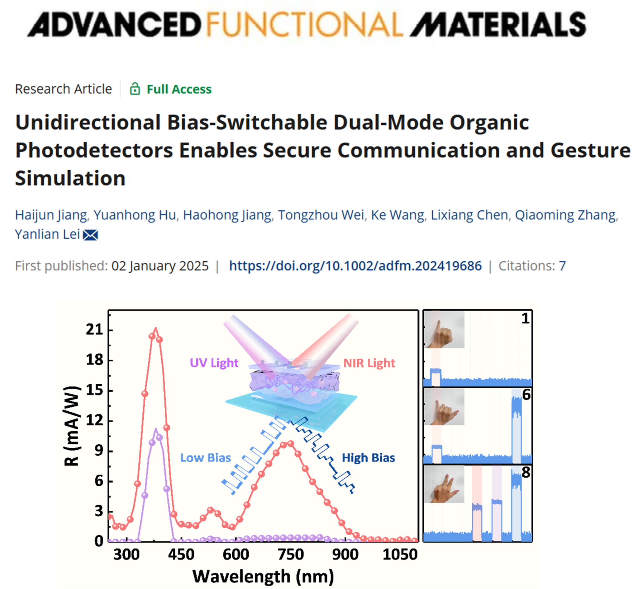 针对传统双波段器件需要改变外部电压极性或者光入射方向来切换光谱响应波段和模式这一困境,团队开发了一种单向偏置可切换的双模有机光电探测器。该器件可通过非平衡输运动力学和光场分布来选择性提取载流子,进而实现了选择性光谱检测,即低偏压下紫外光单波段检测以及高偏压下紫外光和近红外光的双波段检测。这种双模式有机光电探测器具有简单的单层结构,允许直接的单侧光入射,无需电压极性切换,从而简化了设备架构并降低了操作复杂性。实验结果表明,该器件能够有效处理和分离混合光信号,具备简单的手势模拟等功能,为数字通信系统的安全性和功能性提供了新的思路和解决方案。相关结果以“Unidirectional Bias-Switchable Dual-Mode Organic Photodetectors Enables Secure Communication and Gesture Simulation”为题发表在《Advanced Function Materials》(35, 2419686, 2025)上,51风流2022级硕士研究生蒋海军为该论文的第一作者,雷衍连副教授为通讯作者,51风流 (微纳结构光电子学重庆市重点实验室)为唯一完成单位。