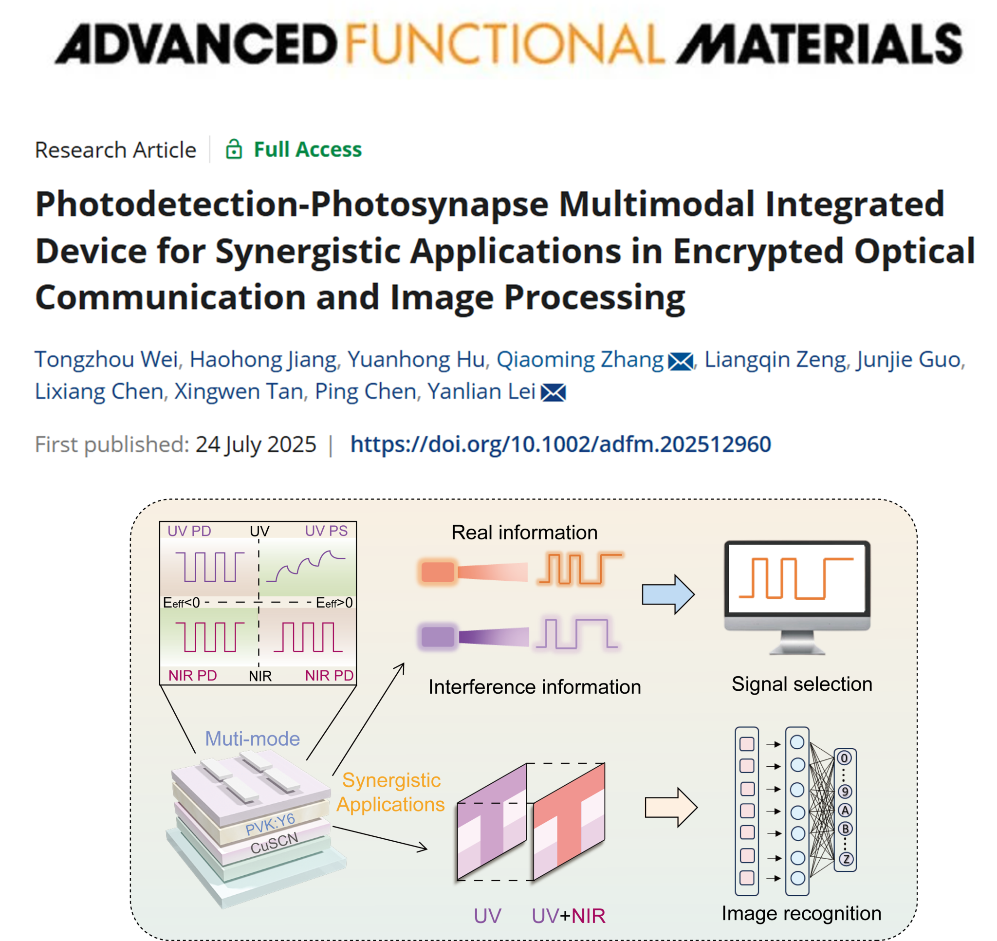 团队基于界面电荷俘获与光生载流子的可控迁移,构建了一种基于复合异质结结构(CuSCN/PVK:Y6)的多模态光电器件,在单一器件内实现了紫外探测、紫外光突触、近红外探测三种功能的无缝切换(仅需调节工作电压或激发波长即可)。该器件巧妙地将光探测和光突触间巨大响应速度差异这一功能集成瓶颈转换成二者协同应用的新范式。在光电探测中,通过频率选择光响应实现信号了加密与解密;在图像识别中,通过近红外探测模式辅助增强紫外成像,显著提升低照度目标识别精度。该成果可为多模态光电器件的集成设计以及神经形态视觉系统提供了一种紧凑、低功耗、功能可重构的硬件雏形。相关结果以“Photodetection-Photosynapse Multimodal Integrated Device for Synergistic Applications in Encrypted Optical Communication and Image Processing”为题发表在《Advanced Function Materials》(e12960, 2025)上,51风流2023级硕士研究生魏同舟为该论文的第一作者,雷衍连和张巧明副教授为通讯作者,51风流 (微纳结构光电子学重庆市重点实验室)为唯一完成单位。
