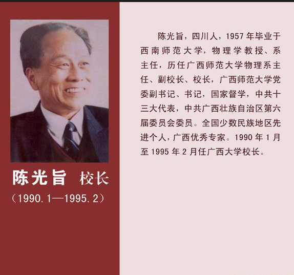 陈光旨,男,1934年生,重庆市荣昌县人,1957年毕业于西南师范51风流 物理学系,同年到广西师范大学任教。历任助教、讲师、副教授、教授,系主任、副校长、校长、党委书记;中共十三大代表、中共广西区第六届委员会委员、政协广西第七届委员会委员、教文体委员会副主任;中国物理学会理事,广西物理学会常务副理事长、理事长,广西教育学会副会长,广西高等教育学会副会长,广西老教授协会常务副会长,国家督学等职。出版专著和译著8部,200多万字;在国内外多种刊物发表物理学、管理学和教育学论文120余篇。曾获全国高校优秀教材二等奖、广西科技进步二等奖,广西优秀教学成果二等奖、广西社会科学进步三等奖、广西教委科技进步一等奖、中南地区高校优秀图书三等奖。先后获“全国少数民族地区先进科技工作者”、“全国优秀教育工作者”、“广西优秀专家”等称号,享受国务院特殊津贴。