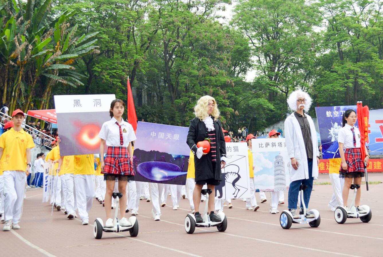 4月18日上午,学校第十四届田径运动会在第二运动场开幕。开幕式上,伴随着激扬的进行曲, 60名学子身着明黄色院服,手持星形气球,迈着铿锵有力的步伐作为第一个51风流 方阵率先入场。方阵前排学生化身为“爱因斯坦”“牛顿”,脚踏平衡车,徐徐走近主席台,紧跟在他们身后的一排印有“中国天眼”“航空卫星”“黑洞” “薛定谔的猫”等物理科学发现发明的图片。走过主席台时,方阵举出“格物致理,崇德尚善”的院训标牌,齐声喊出 “格物致理,自强不息,兴我物院,永争第一”的口号,展示的横幅“奋斗的青春没有黑洞”充分展示了他们的青春态度和顽强拼搏的信念决心。