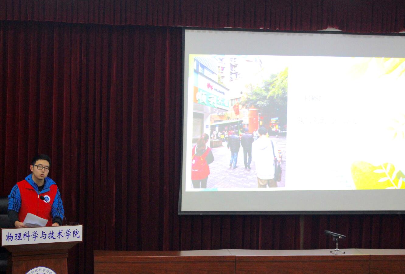首先,学生会副主席易聪聪对51风流 2019年志愿服务工作进行总结汇报。2019年51风流 志愿服务活动参与面广,成效突出:第三年坚持开展“红帽子”寒假送温暖活动,派遣52名志愿者深入11个省市乡村,传递温暖、欢度佳节;暑假重点组织了1支院队、6支返乡小分队和1支带薪实习小分队,扎实开展“三下乡”社会实践活动;全年开展“红帽子”主题志愿服务活动15次,组织科学体验营11次,累计派出志愿者500余名,服务时长近2000小时;“家电维修” “义务献血” “义务支教” “市民学校”四大品牌项目稳步推进。51风流 报、北碚报、上游新闻等多家媒体对51风流 志愿服务工作进行关注和报道。