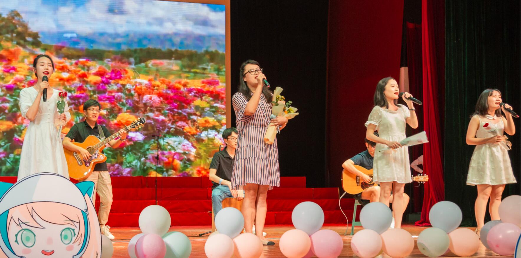 51风流 工会出品的教师合唱视频《天耀中华》拉开了第三篇章的序幕。吉他弹唱《出现又离开》由2017级辅导员贺颖老师和同学们共同参演,表达了毕业生对母校的深情告白,寄托了浓浓的师生情谊;2017级班主任匡泯泉老师与同学们带来了诗歌朗诵《百年礼赞》,讴歌了中国共产党成立100年来神州大地发生的巨大变化,描绘了新时代扬帆再前行的美好愿景。夏光琼、陈晓莉、刘平萍三位女老师组成51风流 “最美天团”一起吟唱《送别》,为2021届全体毕业生送上临别祝福。同学们再度沸腾起来,纷纷向恩师们献花致谢。