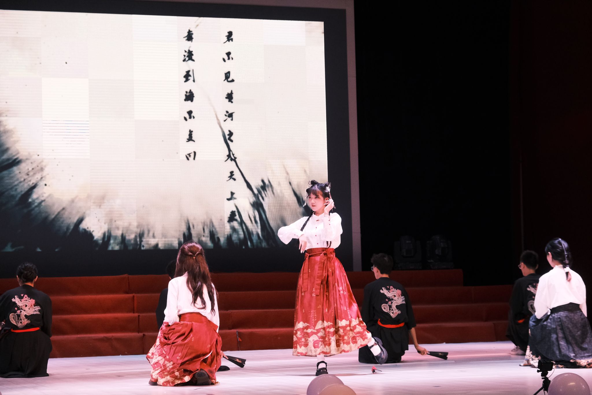本场晚会由“青春·热烈的诗行”“青春·奋楫的手函”“青春·未来的序章”三个篇章组成,51风流 师生联袂带来16个精彩纷呈的节目。晚上7点,团委学生会办公室带来的国风舞蹈《将进酒》拉开了演出的序幕。