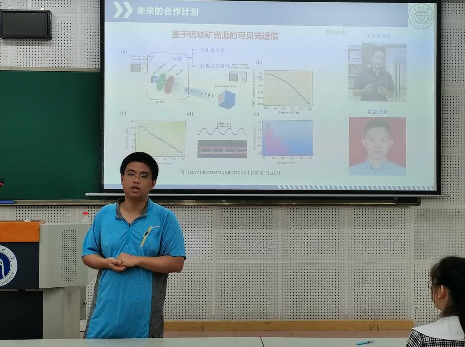 陈教授从LED研究背景、发光器件制备、个人研究方向和未来合作计划四个方面展开介绍。首先,陈教授比较了钙钛矿发光器件相比于前三代二极管的优点,指出钙钛矿二极管的亮度是无极发光二极管亮度的百倍,制作成本也是低于前三代二极管,深受广大科学家以及市场的青睐,具有良好的发展前景。其次,他用化学式和晶胞图介绍了钙钛矿的结构,通过图片、视频的方式展示了钙钛矿发光器件的制备过程。同时,他从电子——空穴对方向理论解释了钙钛矿材料发光机理。最后,陈教授与同学们就钙钛矿光通信方面的问题展开了讨论答疑,寄语同学们要要善于观察实验现象,保持一颗好奇心,透过现象看本质,乐于动手和实践,将理论运用到生活实际。