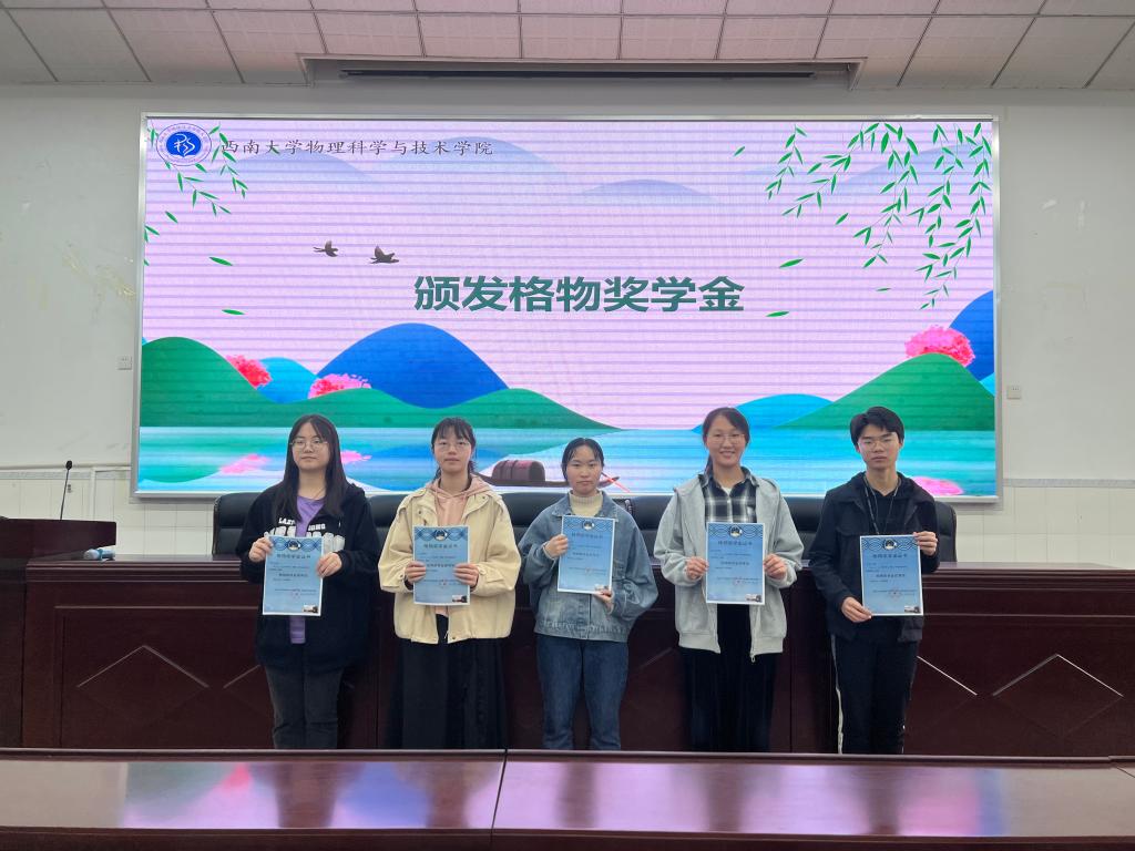 “为激励同学们热爱物理科学和物理教育事业,提升研究水平和教育教学能力,2012届本科毕业校友牵头设立了格物奖学金”,2021级辅导员黄文静首先宣读了格物奖学金表彰文件,重申格物奖学金的设立初衷及评选机制,并揭晓了获得格物奖学金一等奖的是樊理华、于皓玮两位同学;获得格物奖学金二等奖的是:元浩、杨益、郑晓晴三位同学。在热烈的掌声中,五位同学依次上台领奖并分享学习经验。