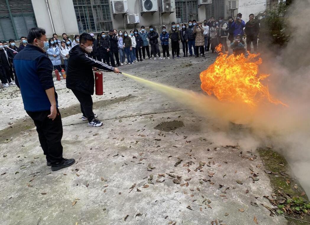 随后,蒋老师针对不同类型的火情详细介绍了相关火灾的应急处理办法,并讲解了灭火器的使用原理,亲自给同学们演示灭火器的使用步骤。在认真学习及近距离观摩后,部分同学亲手尝试扑灭火焰。面对熊熊燃烧的大火,同学们沉着冷静,熟练地按照讲解的灭火步骤将大火迅速而精准地扑灭。