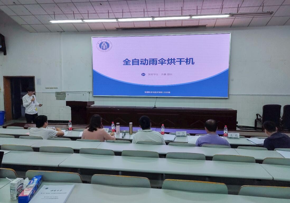 其次上场的是2020级物理学一班的方豪同学,他们小组设计的是《雨伞自动烘干机》,评委老师提出需要解决空气对流、热量散失等问题,强调了制作工艺的关键性;来自2019级师范二班的覃宇航同学进行了题为《珠子动力学》的研究答辩,从多角度控制单一变量进行实验分析,结合运动模拟仿真分析,得出珠子运动的非线性方程。