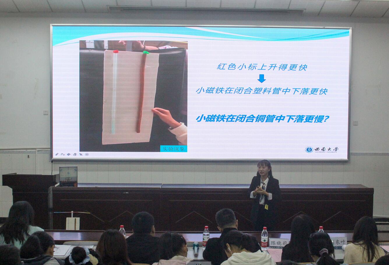本次比赛自十月启动,面向51风流 2018级、2019级师范班与物理学班同学全面开展。五十名同学参与班级初赛,十二名选手参与年级复赛,最终有六名选手通过初赛、复赛的选拔进入决赛。决赛分为课堂模拟教学和“三笔字”书写两个部分。在课堂模拟教学环节中,六名选手分为三组,每组的两名选手讲授同一个课题,选手们依次上台进行两分钟的说课和十分钟的讲课,并回答评委提出的相关问题。2018级师范1班吴艾霜同学第一个上场,通过演示楞次定律相关自制教具和实验,直观地分析了磁铁在不同运动情况下感应电流的方向,并利用表格清晰地呈现课程的知识点。讲授同一课题的2018级师范1班尹浚龙同学教态亲切自然,通过“磁铁带动线圈小船运动”的具体情景引入课题,并利用自制教具形象地解释了“俯视电流方向”,进而揭示了楞次定律的阻碍作用。2018级师范3班秦慧敏同学以乘坐电梯的生活实例,配合条理清晰的板书解释了超重与失重的概念。2018级师范3班桂沁纯同学语调抑扬顿挫,教态大方得体,在授课过程中善于引导学生联系生活实际思考物理问题,结合“上下蹲起时体重计的示数变化”的实例讲解了超重与失重这一课题。2019级师范1班冉琳允同学的课堂幽默有趣,快速吸引了评委和观众的注意力,他以摩天轮的实例引入课题,通过类比直线运动引入线速度的概念,再结合圆周运动的特殊性引出了角速度的概念。2019级师范1班赵立佳同学借助“地球和月球的对话”引导观众思考“如何比较圆周运动的快慢”,进而提出四个猜想,在验证过程中利用数形结合的方式推导出线速度、角速度、周期等知识。
