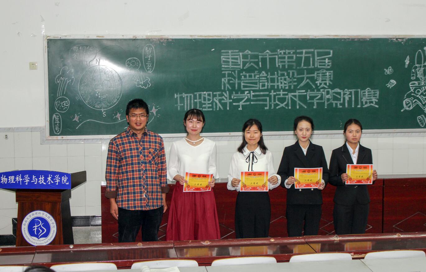 经过激烈的角逐, 2017级2班刘潇涵、2017级物理学班董思佳荣获一等奖;2016级物理学班朱一凡等三名同学获二等奖;2015级普师班邢玉陟等四名同学获三等奖;2016级4班,2017级4班获优秀组织奖。刘潇涵、董思佳、朱一凡、周晓涵四名同学将代表51风流 参加北碚赛区比赛。